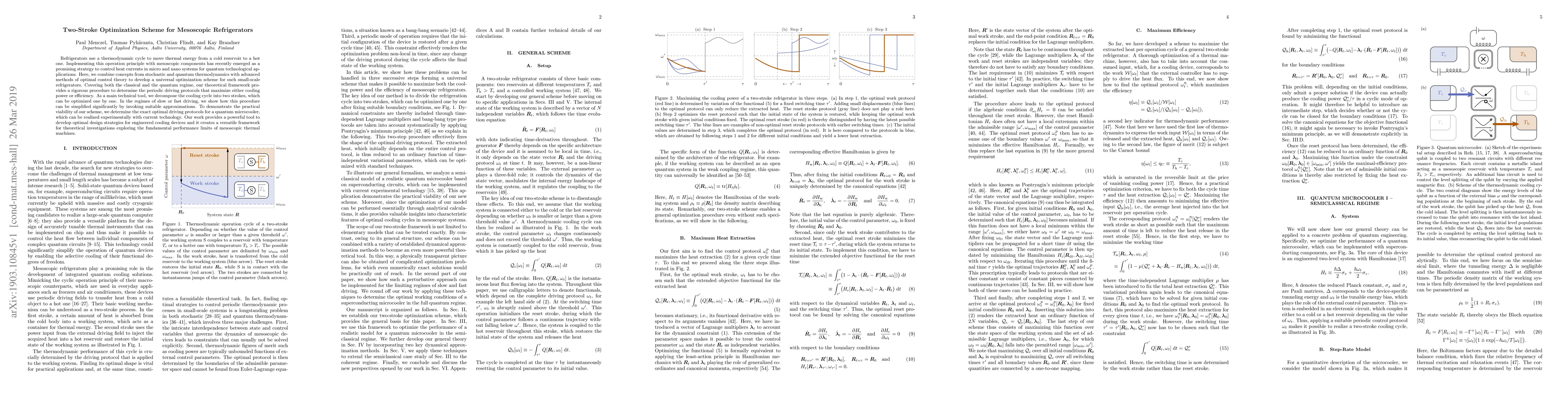 This research introduces a two-stroke optimization scheme for mesoscopic refrigerators, merging stochastic and quantum thermodynamics with optimal control theory. The method determines driving protocols maximizing cooling power or efficiency, applicable across classical and quantum regimes, and demonstrated for a quantum microcooler with potential for current experimental realization.