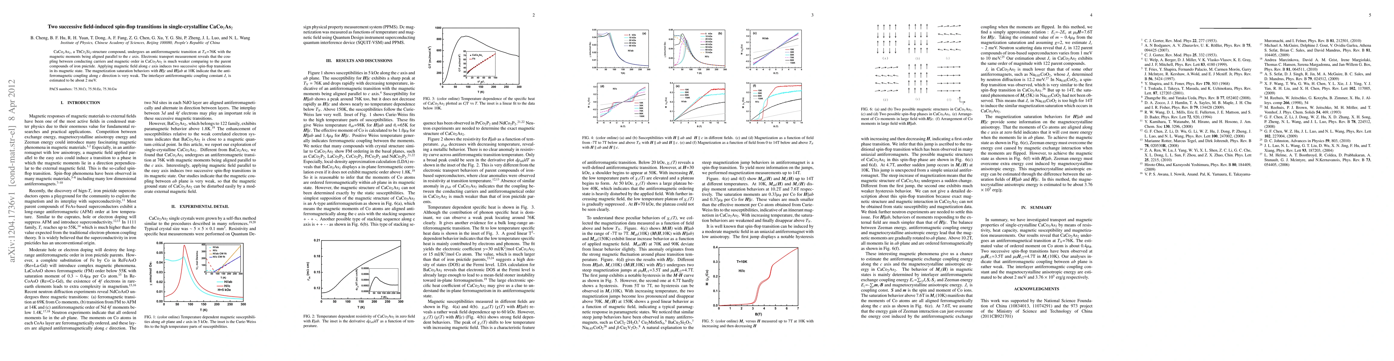 The paper reports that CaCo2As2, a ThCr2Si2-structure compound, exhibits two successive field-induced spin-flop transitions under magnetic fields along the c-axis. The antiferromagnetic transition occurs at T_N=76K, with magnetic moments parallel to the c-axis. Weak coupling between conducting carriers and magnetic order is observed, unlike iron pnictides. Magnetization measurements suggest very weak antiferromagnetic coupling along the c-direction, estimating the interlayer coupling constant J_c to be approximately 2 meV.