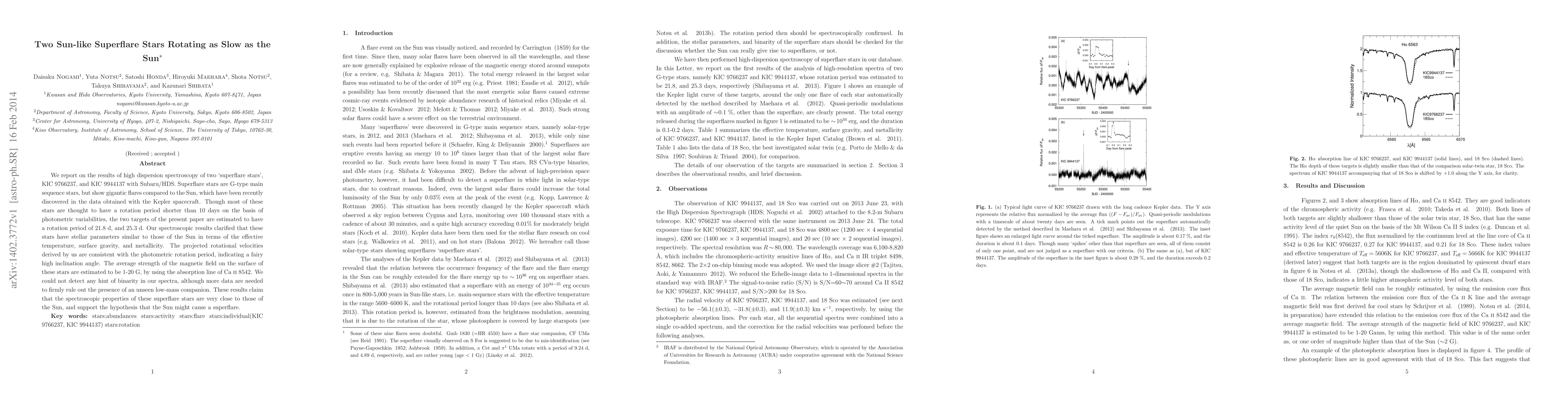We report on the results of high dispersion spectroscopy of two `superflare stars', KIC 9766237, and KIC 9944137 with Subaru/HDS. Superflare stars are G-type main sequence stars, but show gigantic flares compared to the Sun, which have been recently discovered in the data obtained with the Kepler spacecraft. Though most of these stars are thought to have a rotation period shorter than 10 days on the basis of photometric variabilities, the two targets of the present paper are estimated to have a rotation period of 21.8 d, and 25.3 d. Our spectroscopic results clarified that these stars have stellar parameters similar to those of the Sun in terms of the effective temperature, surface gravity, and metallicity. The projected rotational velocities derived by us are consistent with the photometric rotation period, indicating a fairy high inclination angle. The average strength of the magnetic field on the surface of these stars are estimated to be 1-20 G, by using the absorption line of Ca II 8542. We could not detect any hint of binarity in our spectra, although more data are needed to firmly rule out the presence of an unseen low-mass companion. These results claim that the spectroscopic properties of these superflare stars are very close to those of the Sun, and support the hypothesis that the Sun might cause a superflare.