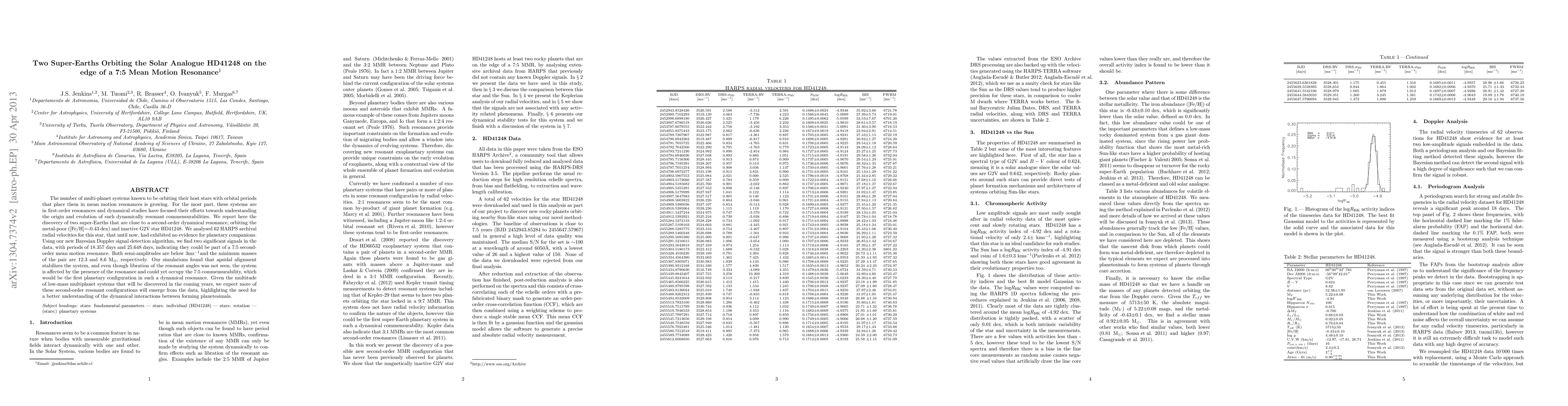 Researchers discovered two super-Earths orbiting the star HD41248, potentially in a 7:5 mean motion resonance, using radial velocity data from the HARPS spectrograph. The planets, with minimum masses of 12.3 and 8.6 Earth masses, exhibit a dynamical stability likely due to apsidal alignment.