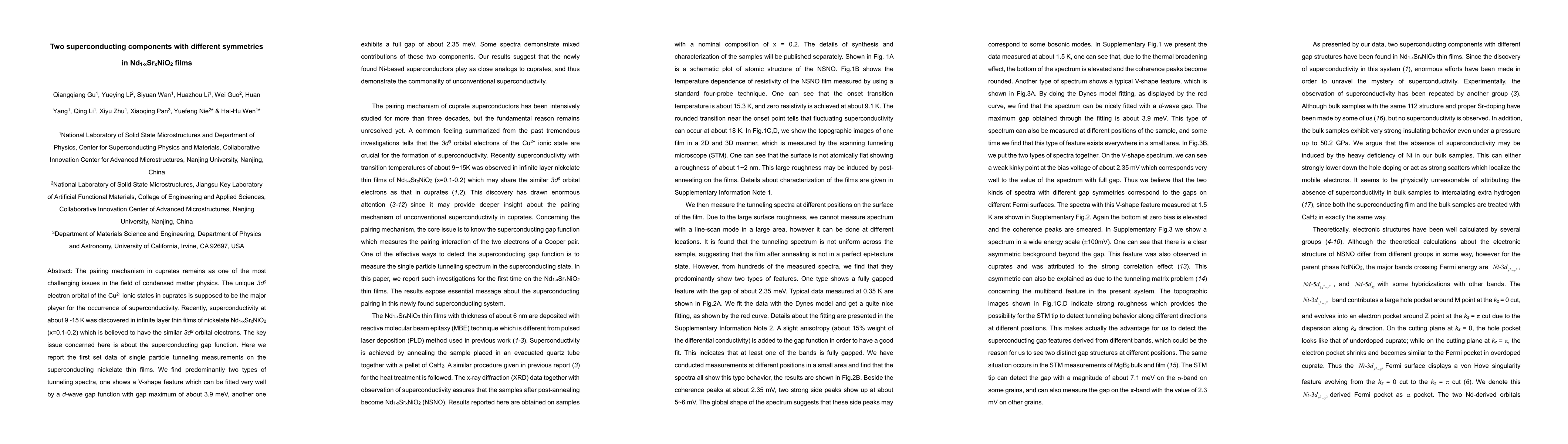 This paper reports single particle tunneling measurements on Nd1-xSrxNiO2 superconducting films, revealing two distinct superconducting gap functions: a d-wave gap and a full gap. The findings suggest that nickelate superconductors may share unconventional superconductivity mechanisms with cuprates.