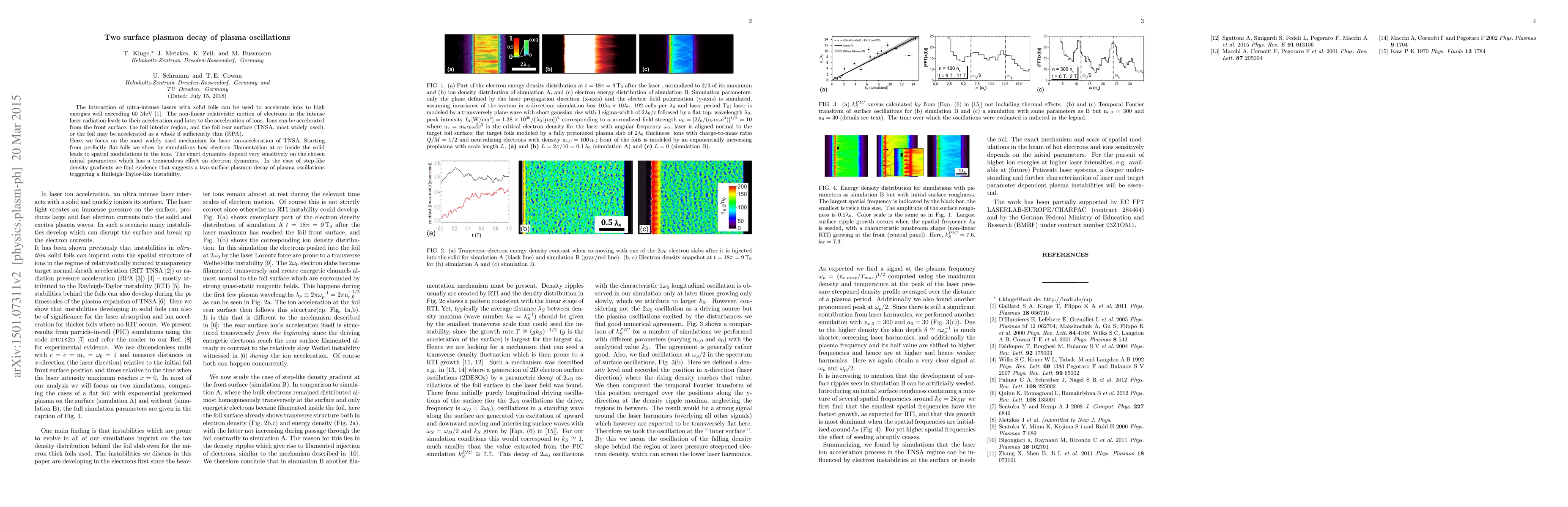The interaction of ultra-intense lasers with solid foils can be used to accelerate ions to high energies well exceeding 60 MeV. The non-linear relativistic motion of electrons in the intense laser radiation leads to their acceleration and later to the acceleration of ions. Ions can be accelerated from the front surface, the foil interior region, and the foil rear surface (TNSA, most widely used), or the foil may be accelerated as a whole if sufficiently thin (RPA). Here, we focus on the most widely used mechanism for laser ion-acceleration of TNSA. Starting from perfectly flat foils we show by simulations how electron filamentation at or inside the solid leads to a spatial modulations in the ions. The exact dynamics depend very sensitively on the chosen initial parameters which has a tremendous effect on electron dynamics. In the case of step-like density gradients we find evidence that suggests a two-surface-plasmon decay of plasma oscillations triggering a Raileigh-Taylor-like instability.