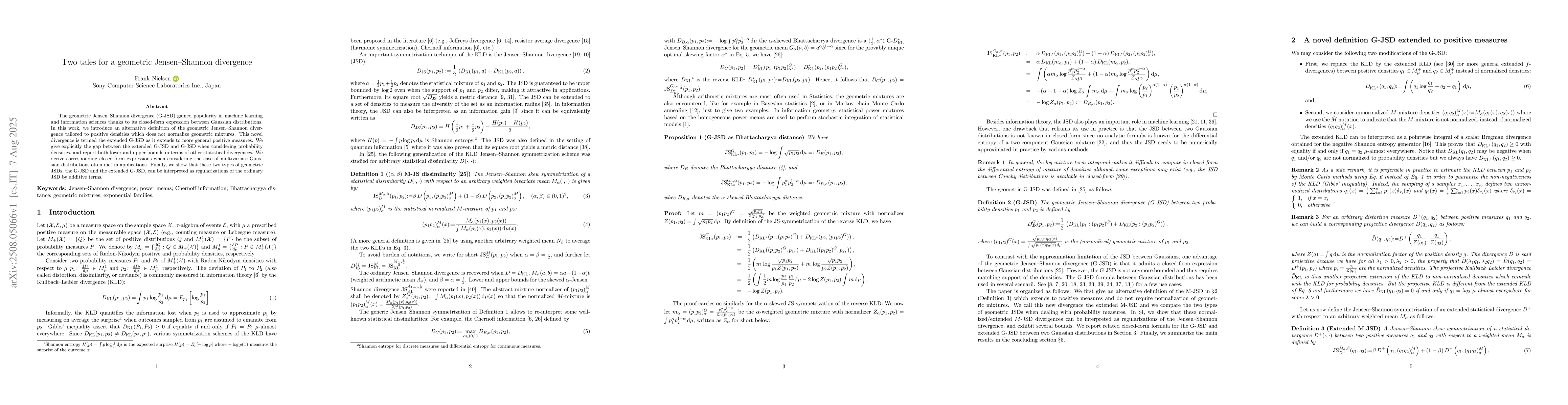 The geometric Jensen--Shannon divergence (G-JSD) gained popularity in machine learning and information sciences thanks to its closed-form expression between Gaussian distributions. In this work, we introduce an alternative definition of the geometric Jensen--Shannon divergence tailored to positive densities which does not normalize geometric mixtures. This novel divergence is termed the extended G-JSD as it extends to more general positive measures. We give explicitly the gap between the extended G-JSD and G-JSD when considering probability densities, and report both lower and upper bounds in terms of other statistical divergences. We derive corresponding closed-form expressions when considering the case of multivariate Gaussian distributions often met in applications. Finally, we show that these two types of geometric JSDs, the G-JSD and the extended G-JSD, can be interpreted as regularizations of the ordinary JSD by additive terms.