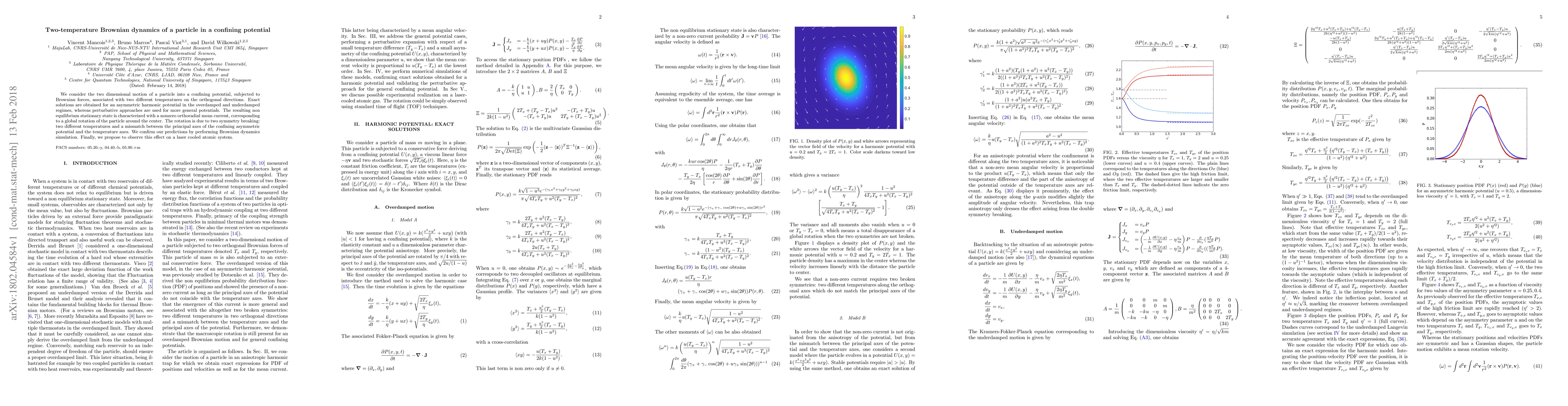 This paper investigates the two-dimensional motion of a particle in a confining potential under Brownian forces with two different temperatures. It derives exact solutions for asymmetric harmonic potentials and uses perturbative methods for general potentials, revealing a non-equilibrium stationary state with a global rotational motion due to symmetry breaking from differing temperatures and potential axis mismatch. Simulations confirm these findings and suggest observing the effect in laser-cooled atomic systems.