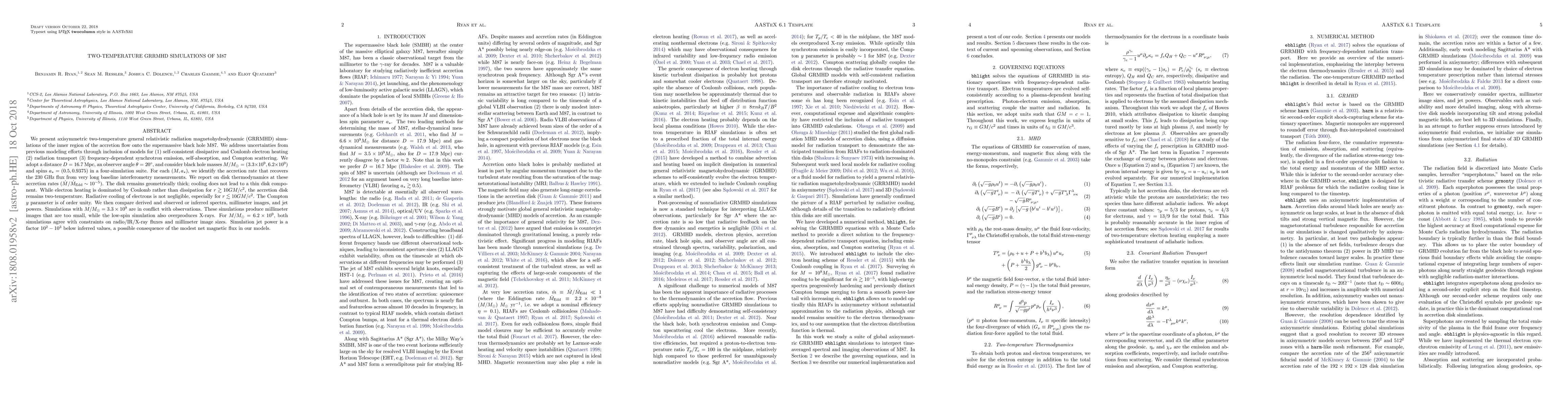 We present axisymmetric two-temperature general relativistic radiation magnetohydrodynamic (GRRMHD) simulations of the inner region of the accretion flow onto the supermassive black hole M87. We address uncertainties from previous modeling efforts through inclusion of models for (1) self-consistent dissipative and Coulomb electron heating (2) radiation transport (3) frequency-dependent synchrotron emission, self-absorption, and Compton scattering. We adopt a distance $D=16.7$ Mpc, an observer angle $\theta = 20^{\circ}$, and consider black hole masses $M/M_{\odot} = (3.3\times10^{9}, 6.2\times10^{9})$ and spins $a_{\star} = (0.5, 0.9375)$ in a four-simulation suite. For each $(M, a_{\star})$, we identify the accretion rate that recovers the 230 GHz flux from VLBI measurements. We report on disk thermodynamics at these accretion rates ($\dot{M}/\dot{M}_{\mathrm{Edd}} \sim 10^{-5}$). The disk remains geometrically thick; cooling does not lead to a thin disk component. While electron heating is dominated by Coulomb rather than dissipation for $r \gtrsim 10 GM/c^2$, the accretion disk remains two-temperature. Radiative cooling of electrons is not negligible, especially for $r \lesssim 10 GM/c^2$. The Compton $y$ parameter is of order unity. We then compare derived and observed or inferred spectra, mm images, and jet powers. Simulations with $M/M_{\odot} = 3.3\times10^{9}$ are in conflict with observations. These simulations produce mm images that are too small, while the low-spin simulation also overproduces X-rays. For $M/M_{\odot} = 6.2\times10^{9}$, both simulations agree with constraints on radio/IR/X-ray fluxes and mm image sizes. Simulation jet power is a factor $10^2-10^3$ below inferred values, a possible consequence of the modest net magnetic flux in our models.