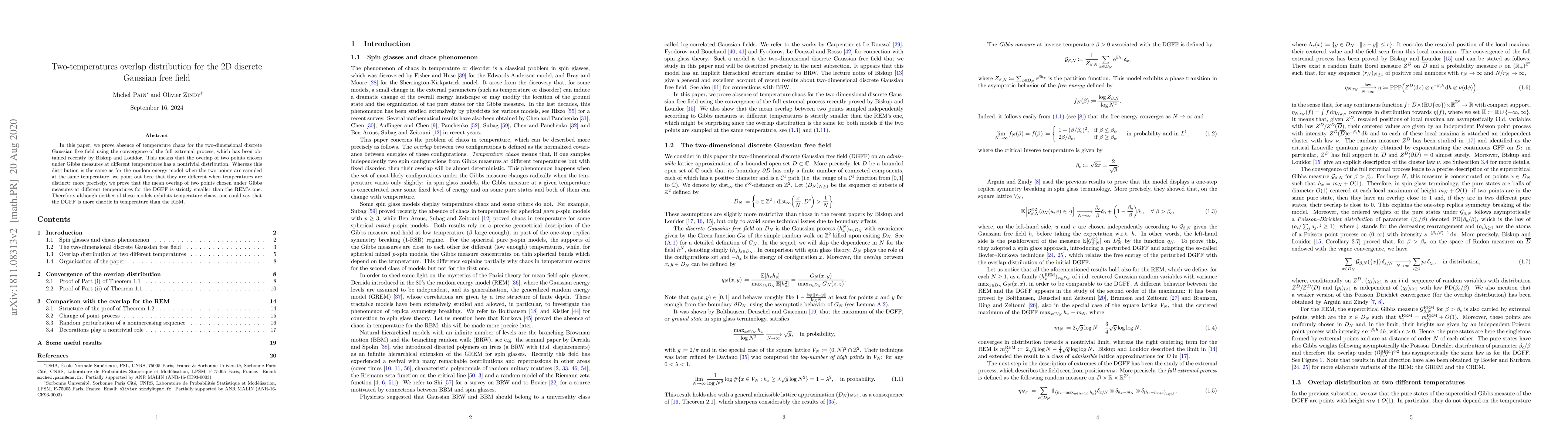 In this paper, we prove absence of temperature chaos for the two-dimensional discrete Gaussian free field using the convergence of the full extremal process, which has been obtained recently by Biskup and Louidor. This means that the overlap of two points chosen under Gibbs measures at different temperatures has a nontrivial distribution. Whereas this distribution is the same as for the random energy model when the two points are sampled at the same temperature, we point out here that they are different when temperatures are distinct: more precisely, we prove that the mean overlap of two points chosen under Gibbs measures at different temperatures for the DGFF is strictly smaller than the REM's one. Therefore, although neither of these models exhibits temperature chaos, one could say that the DGFF is more chaotic in temperature than the REM.