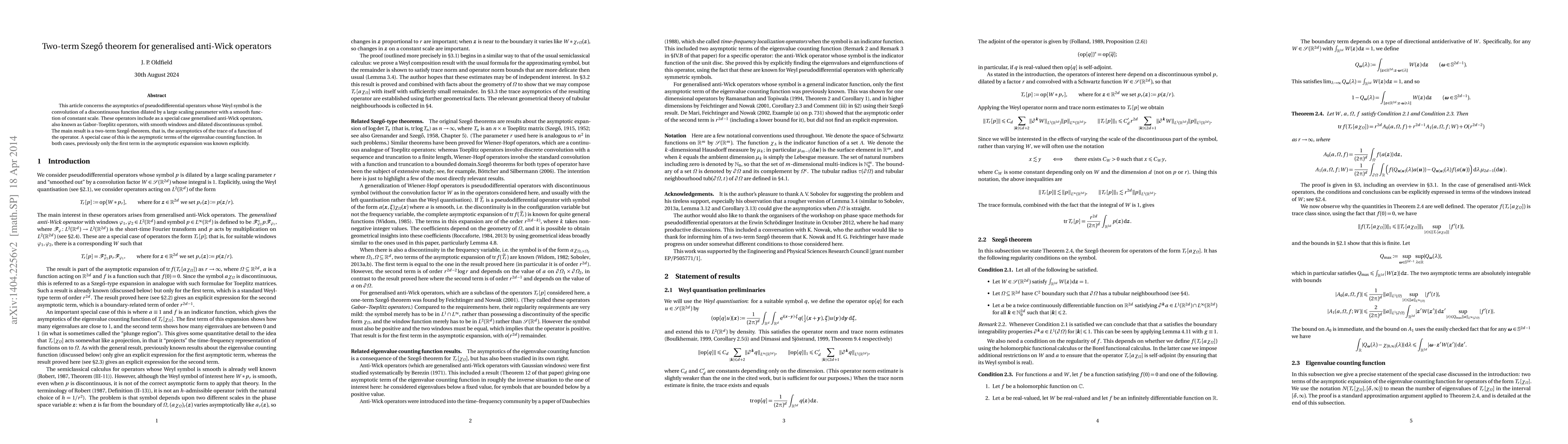 This article concerns the asymptotics of pseudodifferential operators whose Weyl symbol is the convolution of a discontinuous function dilated by a large scaling parameter with a smooth function of constant scale. These operators include as a special case generalised anti-Wick operators, also known as Gabor-Toeplitz operators, with smooth windows and dilated discontinuous symbol. The main result is a two-term Szeg\H{o} theorem, that is, the asymptotics of the trace of a function of the operator. A special case of this is the asymptotic terms of the eigenvalue counting function. In both cases, previously only the first term in the asymptotic expansion was known explicitly.