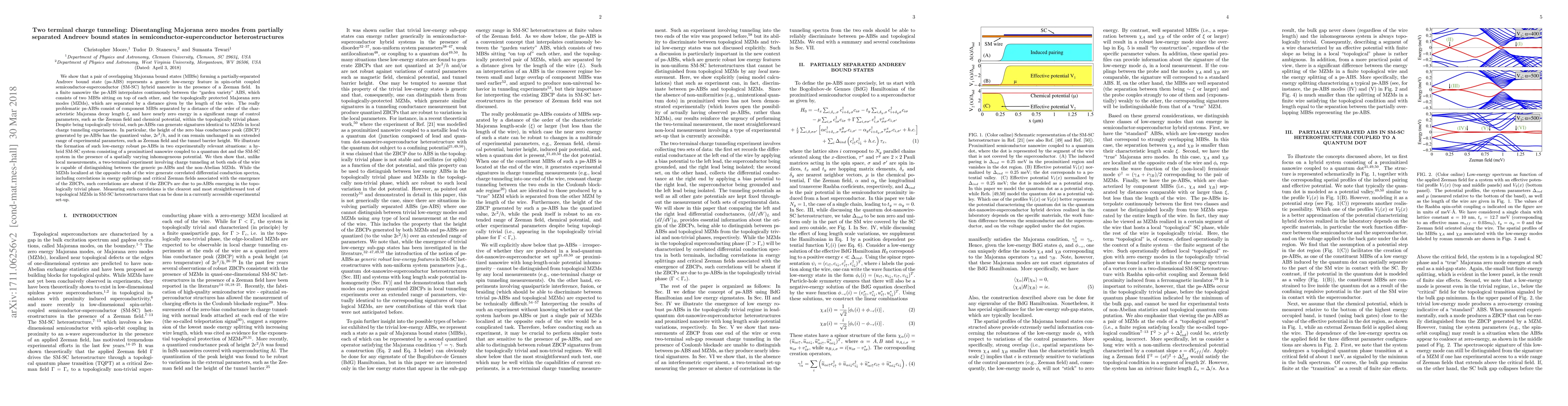 This paper explores the distinction between Majorana zero modes (MZMs) and partially separated Andreev bound states (ps-ABSs) in semiconductor-superconductor hybrid nanowires. It demonstrates that ps-ABSs, despite being topologically trivial, can mimic MZMs in local charge tunneling experiments, particularly in generating quantized zero bias conductance peaks. However, a two-terminal charge tunneling experiment can differentiate MZMs from ps-ABSs by detecting correlations in differential conduction spectra, which are present for MZMs but absent for ps-ABSs.
