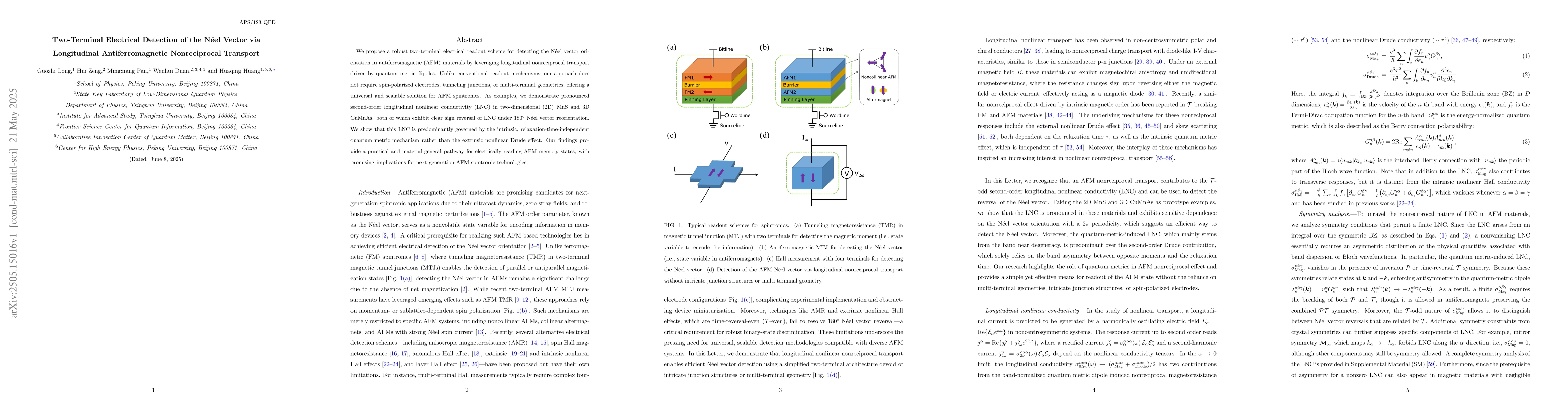 The paper introduces a novel two-terminal electrical readout scheme for detecting Néel vector orientation in antiferromagnetic materials based on longitudinal nonreciprocal transport.