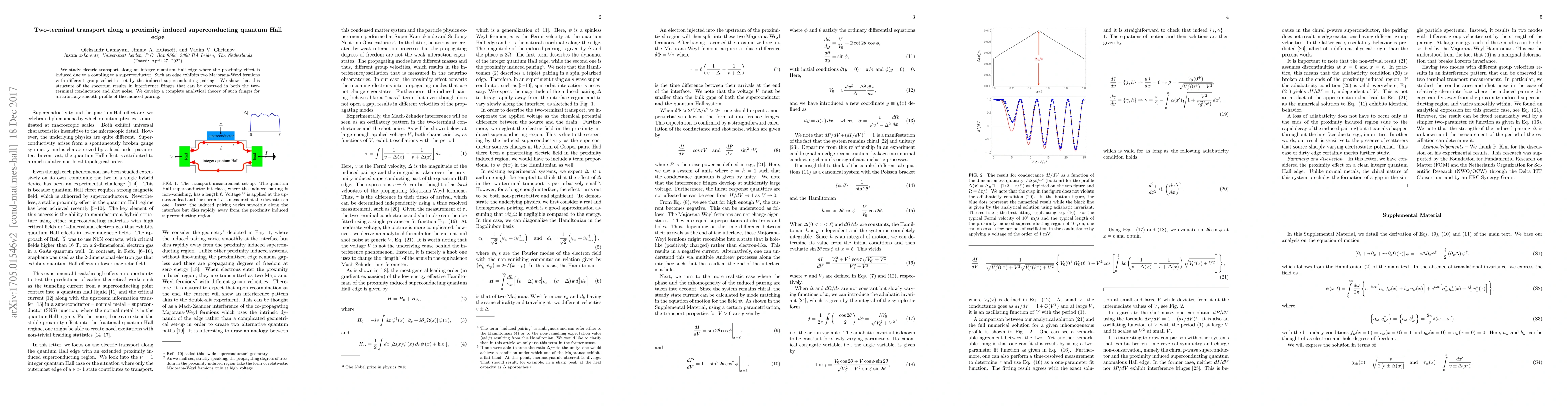 Summary: This paper investigates electric transport along a quantum Hall edge influenced by proximity-induced superconductivity, revealing interference fringes in conductance and shot noise due to Majorana-Weyl fermions. It provides an analytical theory for these fringes across varying superconducting pairing profiles.