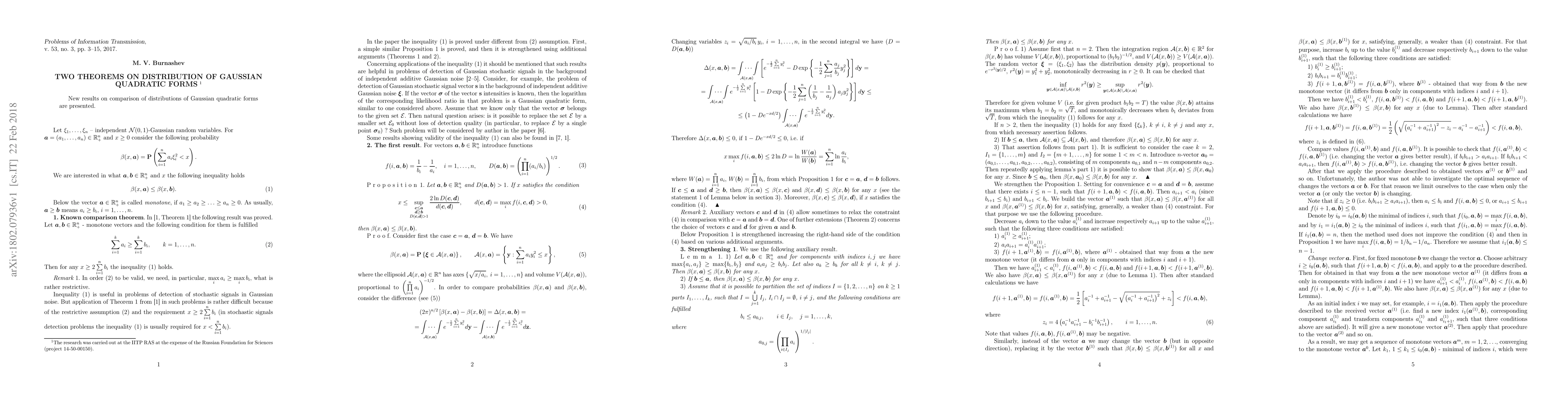 Summary: This paper presents two new theorems comparing the distributions of Gaussian quadratic forms, contributing to the understanding of their statistical properties and relationships. The findings provide valuable insights into the behavior of these forms in various applications.