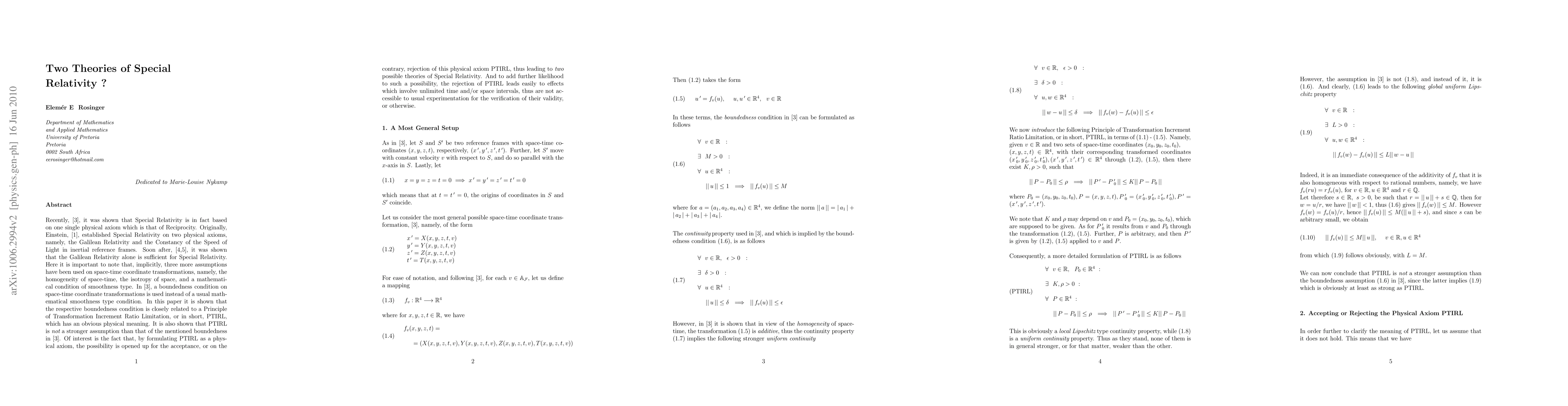 Recently, [3], it was shown that Special Relativity is in fact based on one single physical axiom which is that of Reciprocity. Originally, Einstein, [1], established Special Relativity on two physical axioms, namely, the Galilean Relativity and the Constancy of the Speed of Light in inertial reference frames. Soon after, [4,5], it was shown that the Galilean Relativity alone is sufficient for Special Relativity. Here it is important to note that, implicitly, three more assumptions have been used on space-time coordinate transformations, namely, the homogeneity of space-time, the isotropy of space, and a mathematical condition of smoothness type. In [3], a boundedness condition on space-time coordinate transformations is used instead of a usual mathematical smoothness type condition. In this paper it is shown that the respective boundedness condition is closely related to a Principle of Transformation Increment Ratio Limitation, or in short, PTIRL, which has an obvious physical meaning. It is also shown that PTIRL is {\it not} a stronger assumption than that of the mentioned boundedness in [3]. Of interest is the fact that, by formulating PTIRL as a physical axiom, the possibility is opened up for the acceptance, or on the contrary, rejection of this physical axiom PTIRL, thus leading to {\it two} possible theories of Special Relativity. And to add further likelihood to such a possibility, the rejection of PTIRL leads easily to effects which involve unlimited time and/or space intervals, thus are not accessible to usual experimentation for the verification of their validity, or otherwise.