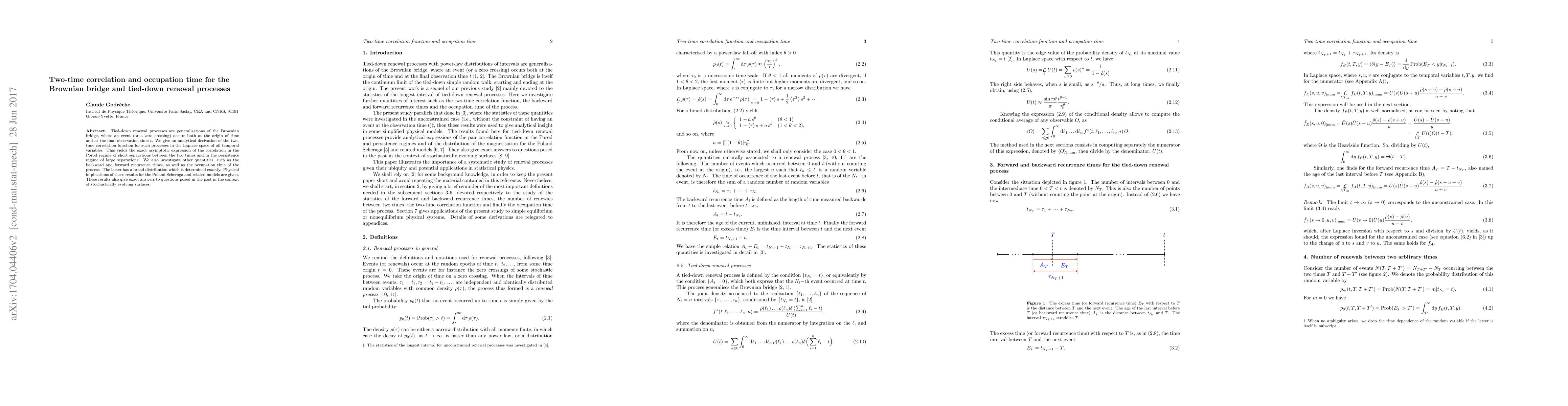 Tied-down renewal processes are generalisations of the Brownian bridge, where an event (or a zero crossing) occurs both at the origin of time and at the final observation time $t$. We give an analytical derivation of the two-time correlation function for such processes in the Laplace space of all temporal variables. This yields the exact asymptotic expression of the correlation in the Porod regime of short separations between the two times and in the persistence regime of large separations. We also investigate other quantities, such as the backward and forward recurrence times, as well as the occupation time of the process. The latter has a broad distribution which is determined exactly. Physical implications of these results for the Poland Scheraga and related models are given. These results also give exact answers to questions posed in the past in the context of stochastically evolving surfaces.
