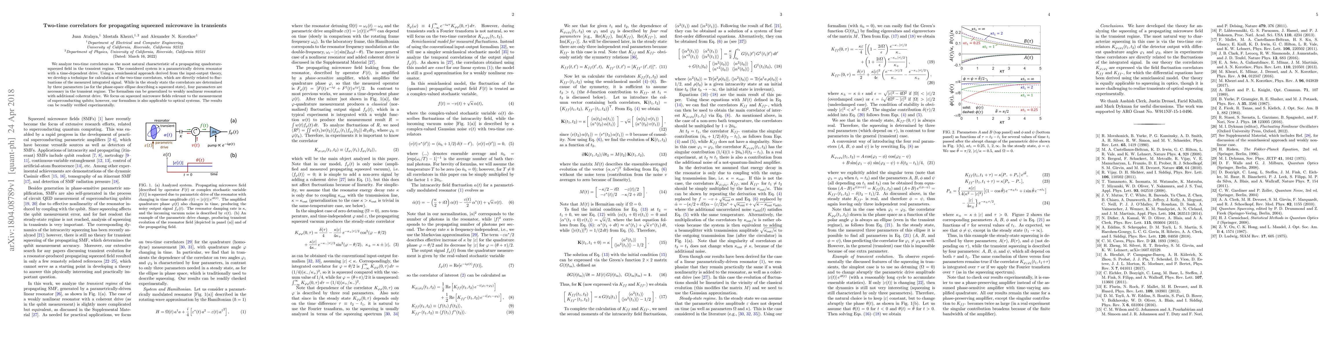 This paper develops a semiclassical approach to calculate two-time correlators for transient quadrature-squeezed fields in parametrically driven microwave resonators, highlighting the additional parameters required in the transient regime compared to steady state. The method is applicable to squeezed microwave fields in superconducting qubits and can be generalized to optical systems.