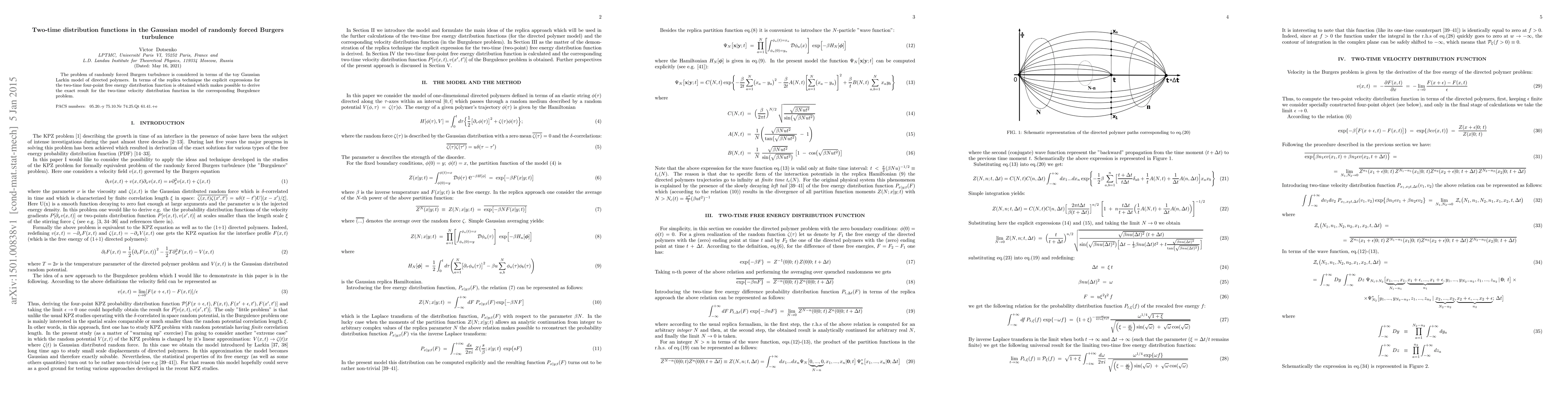This paper investigates randomly forced Burgers turbulence using the Gaussian Larkin model of directed polymers. It employs the replica technique to derive explicit expressions for the two-time four-point free energy distribution function, enabling the exact determination of the two-time velocity distribution function in the Burgulence problem.