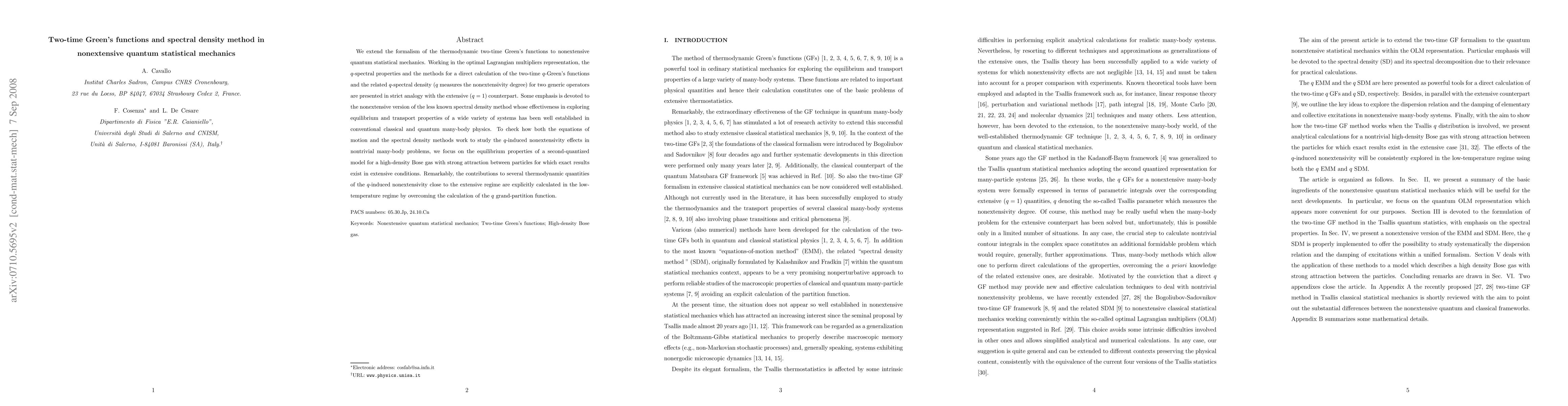 We extend the formalism of the thermodynamic two-time Green's functions to nonextensive quantum statistical mechanics. Working in the optimal Lagrangian multipliers representation, the $q$-spectral properties and the methods for a direct calculation of the two-time $q$% -Green's functions and the related $q$-spectral density ($q$ measures the nonextensivity degree) for two generic operators are presented in strict analogy with the extensive ($q=1$) counterpart. Some emphasis is devoted to the nonextensive version of the less known spectral density method whose effectiveness in exploring equilibrium and transport properties of a wide variety of systems has been well established in conventional classical and quantum many-body physics. To check how both the equations of motion and the spectral density methods work to study the $q$-induced nonextensivity effects in nontrivial many-body problems, we focus on the equilibrium properties of a second-quantized model for a high-density Bose gas with strong attraction between particles for which exact results exist in extensive conditions. Remarkably, the contributions to several thermodynamic quantities of the $q$-induced nonextensivity close to the extensive regime are explicitly calculated in the low-temperature regime by overcoming the calculation of the $q$ grand-partition function.