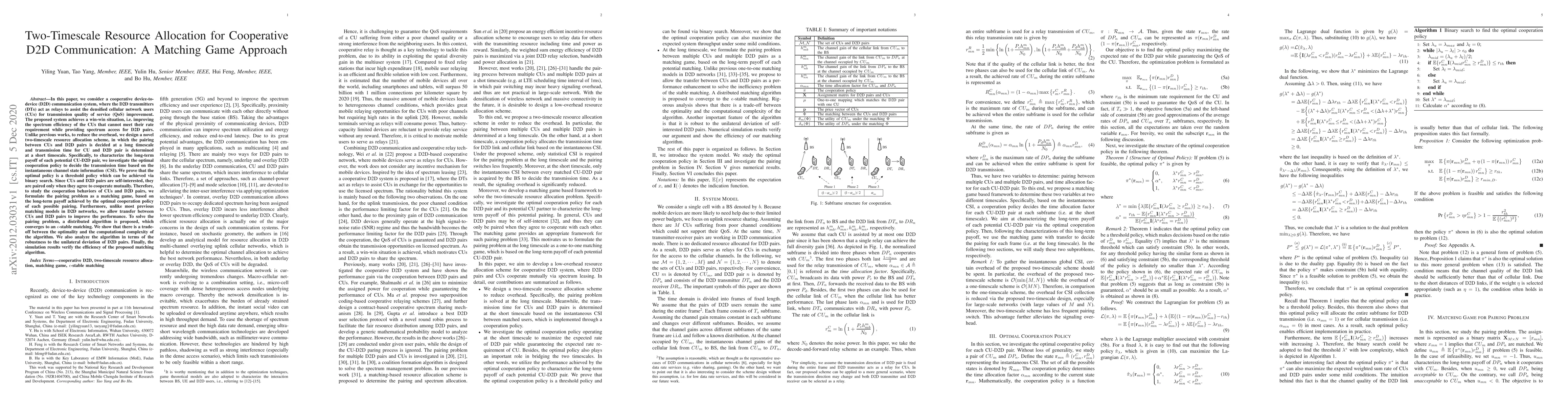 This paper proposes a two-timescale resource allocation scheme for cooperative D2D communication, using a matching game approach to optimize pairing between cellular users and D2D pairs. The scheme reduces overhead by determining pairing at a long timescale and transmission time at a short timescale, achieving improved spectrum efficiency and performance.