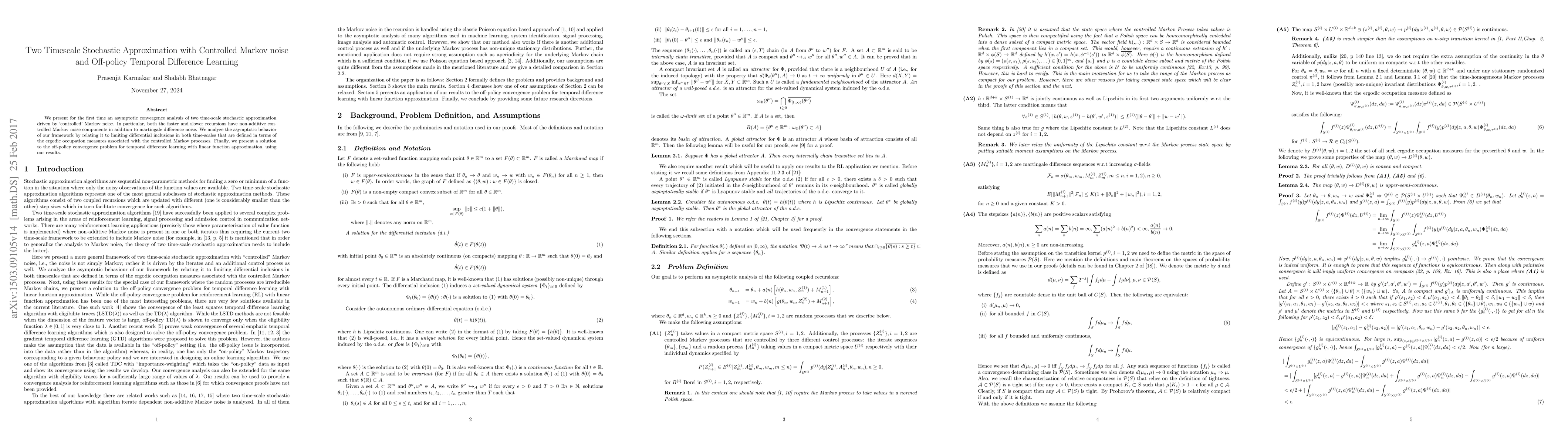 This paper analyzes the asymptotic convergence of two-timescale stochastic approximation with controlled Markov noise, establishing a connection to limiting differential inclusions. It also resolves the off-policy convergence issue in temporal difference learning with linear function approximation.