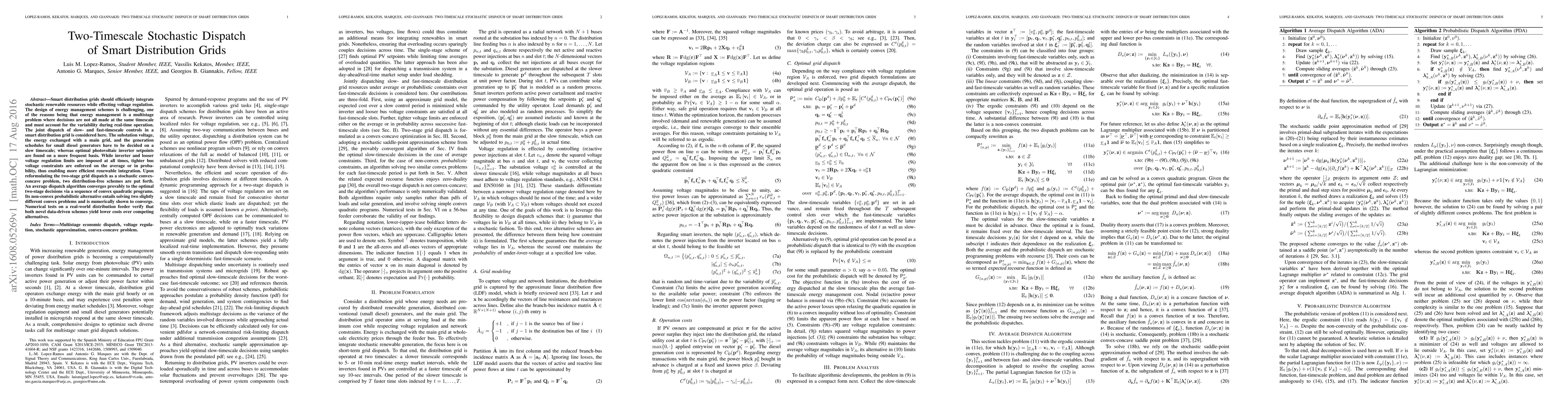 This paper proposes two-timescale stochastic dispatch strategies for smart distribution grids to efficiently integrate renewable energy while managing voltage regulation. It introduces an average dispatch algorithm and a probabilistic alternative, both of which converge to optimal decisions and demonstrate lower costs compared to traditional methods in real-world tests.