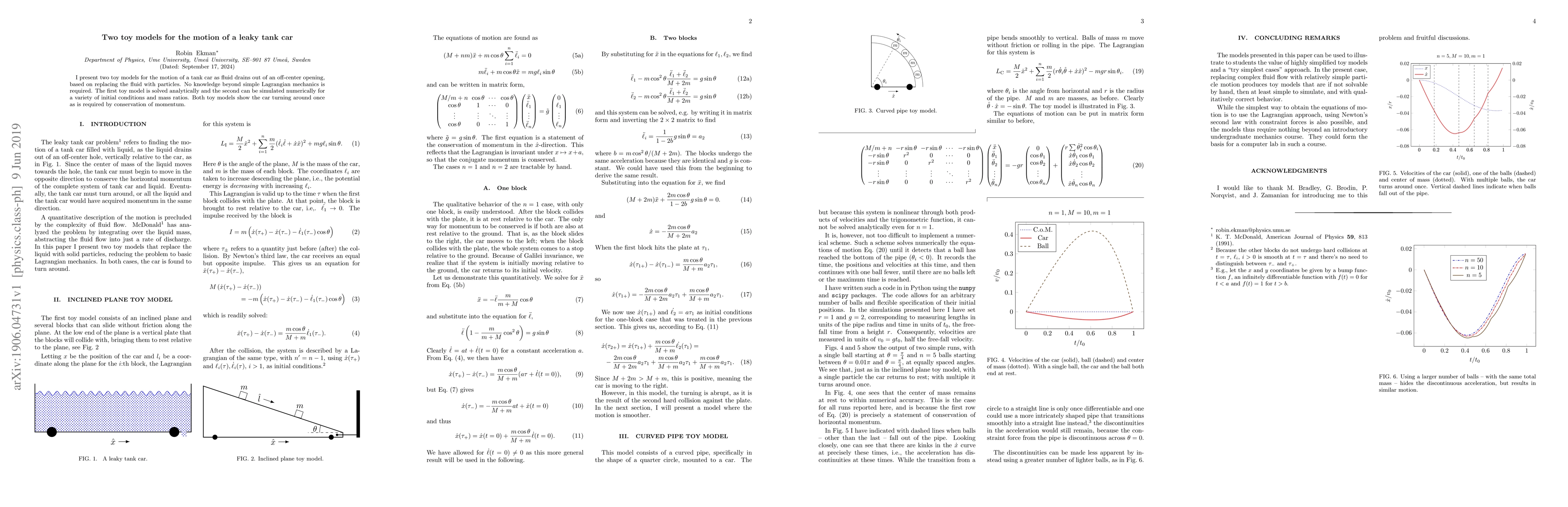 I present two toy models for the motion of a tank car as fluid drains out of an off-center opening, based on replacing the fluid with particles. No knowledge beyond simple Lagrangian mechanics is required. The first toy model is solved analytically and the second can be simulated numerically for a variety of initial conditions and mass ratios. Both toy models show the car turning around once as is required by conservation of momentum.