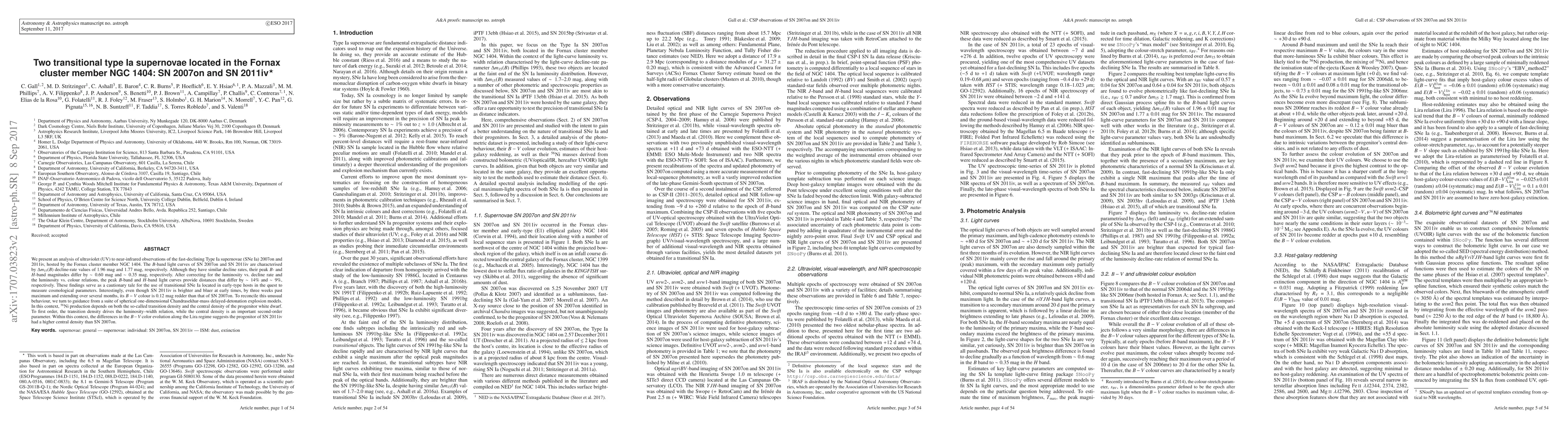 This paper analyzes two transitional Type Ia supernovae (SNe Ia) in NGC 1404, finding similar decline rates but differing peak luminosities and colors. The study highlights the challenges in using these supernovae for cosmological measurements and suggests differences in progenitor white dwarf densities to explain the observed behavior.