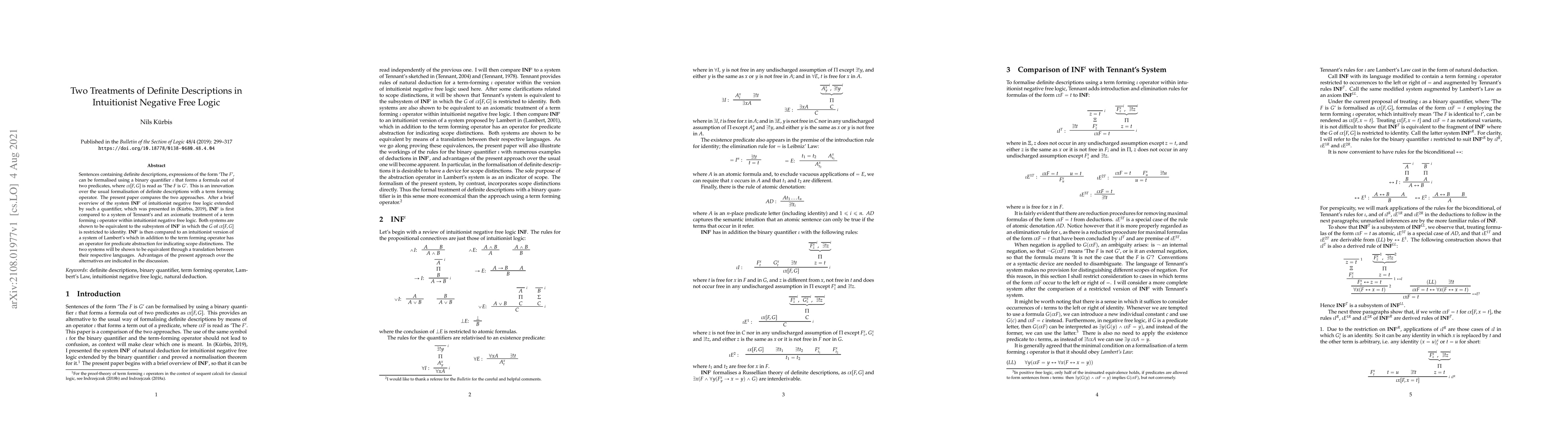Sentences containing definite descriptions, expressions of the form `The $F$', can be formalised using a binary quantifier $\iota$ that forms a formula out of two predicates, where $\iota x[F, G]$ is read as `The $F$ is $G$'. This is an innovation over the usual formalisation of definite descriptions with a term forming operator. The present paper compares the two approaches. After a brief overview of the system $\mathbf{INF}^\iota$ of intuitionist negative free logic extended by such a quantifier, which was presented in \citep{kurbisiotaI}, $\mathbf{INF}^\iota$ is first compared to a system of Tennant's and an axiomatic treatment of a term forming $\iota$ operator within intuitionist negative free logic. Both systems are shown to be equivalent to the subsystem of $\mathbf{INF}^\iota$ in which the $G$ of $\iota x[F, G]$ is restricted to identity. $\mathbf{INF}^\iota$ is then compared to an intuitionist version of a system of Lambert's which in addition to the term forming operator has an operator for predicate abstraction for indicating scope distinctions. The two systems will be shown to be equivalent through a translation between their respective languages. Advantages of the present approach over the alternatives are indicated in the discussion.
