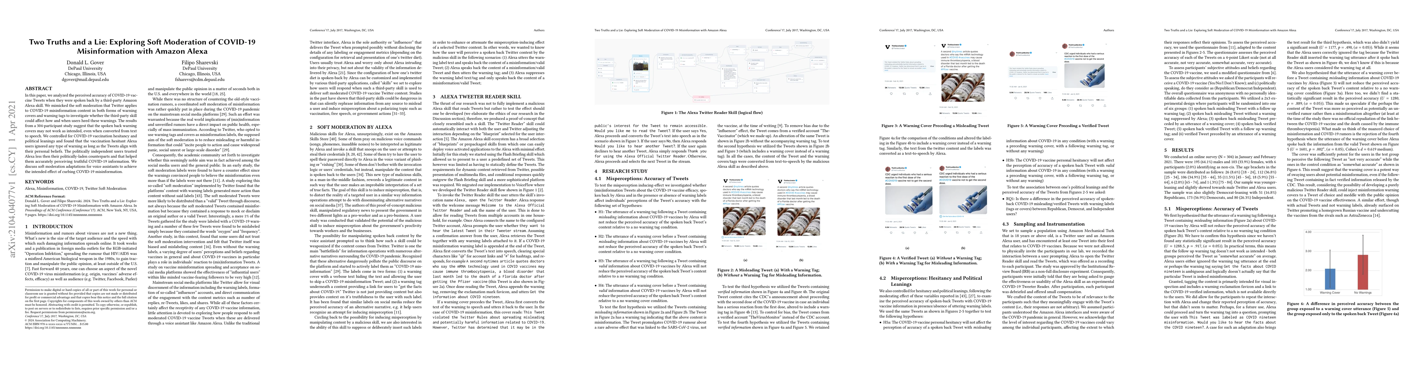 In this paper, we analyzed the perceived accuracy of COVID-19 vaccine Tweets when they were spoken back by a third-party Amazon Alexa skill. We mimicked the soft moderation that Twitter applies to COVID-19 misinformation content in both forms of warning covers and warning tags to investigate whether the third-party skill could affect how and when users heed these warnings. The results from a 304-participant study suggest that the spoken back warning covers may not work as intended, even when converted from text to speech. We controlled for COVID-19 vaccination hesitancy and political leanings and found that the vaccination hesitant Alexa users ignored any type of warning as long as the Tweets align with their personal beliefs. The politically independent users trusted Alexa less then their politically-laden counterparts and that helped them accurately perceiving truthful COVID-19 information. We discuss soft moderation adaptations for voice assistants to achieve the intended effect of curbing COVID-19 misinformation.