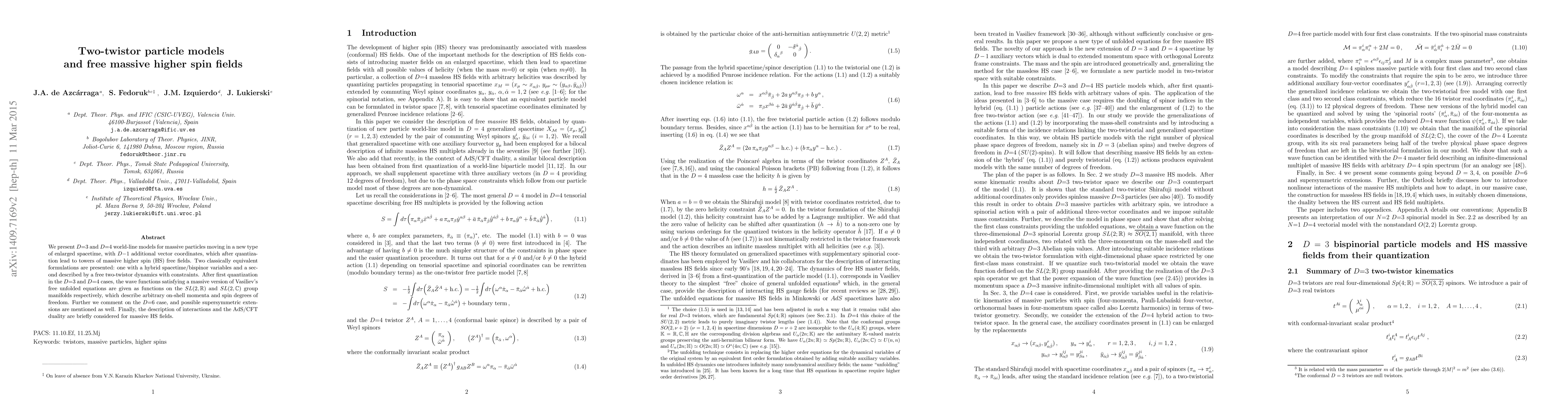 We present D=3 and D=4 models for massive particles moving in a new type of enlarged spacetime, with D-1 additional vector coordinates, which after quantization lead to the towers of massive higher spin (HS) free fields. Two classically equivalent formulations are presented: one with a hybrid spacetime/bispinor geometry and a second described by a free two-twistor dynamics with constraints. After quantization in the D=3 and D=4 cases, the wave functions are given as functions on the SL(2,R) and SL(2,C) group manifolds respectively, and describe arbitrary on-shell momenta and spin degrees of freedom. Finally, the D=6 case and possible supersymmetric extensions are mentioned.