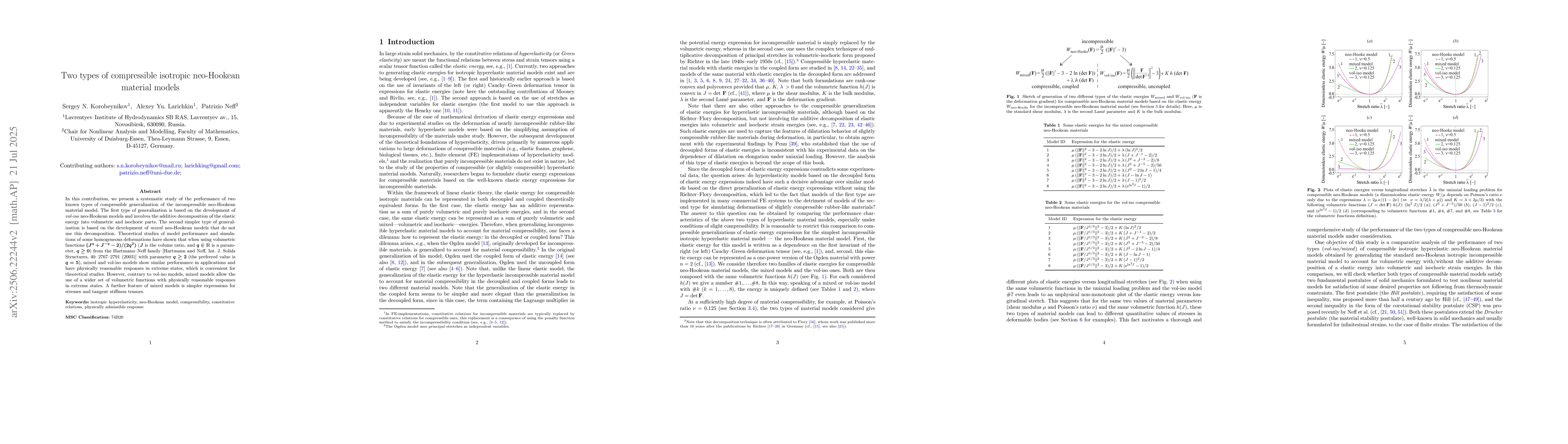 In this book, we present a systematic study of the performance of two known types of compressible generalization of the incompressible neo-Hookean material model. The first type of generalization is based on the development of \emph{vol-iso} neo-Hookean models and involves the additive decomposition of the elastic energy into volumetric and isochoric parts. The second simpler type of generalization is based on the development of \emph{mixed} neo-Hookean models that do not use this decomposition. Theoretical studies of model performance and simulations of some homogeneous deformations have shown that when using volumetric functions $(J^q+J^{-q}-2)/(2q^2)$ ($J$ is the volume ratio, and $q\in \mathbb{R}$ is a parameter, $q\geq 0$) from the Hartmann--Neff family [Hartmann and Neff, Int. J. Solids Structures, 40: 2767--2791 (2003)] with parameter $q\geq 2$ (the preferred value is $q=5$), mixed and vol-iso models show similar performance in applications and have physically reasonable responses in extreme states, which is convenient for theoretical studies. However, contrary to vol-iso models, mixed models allow the use of a wider set of volumetric functions with physically reasonable responses in extreme states. A further feature of mixed models is simpler expressions for stresses and tangent stiffness tensors.