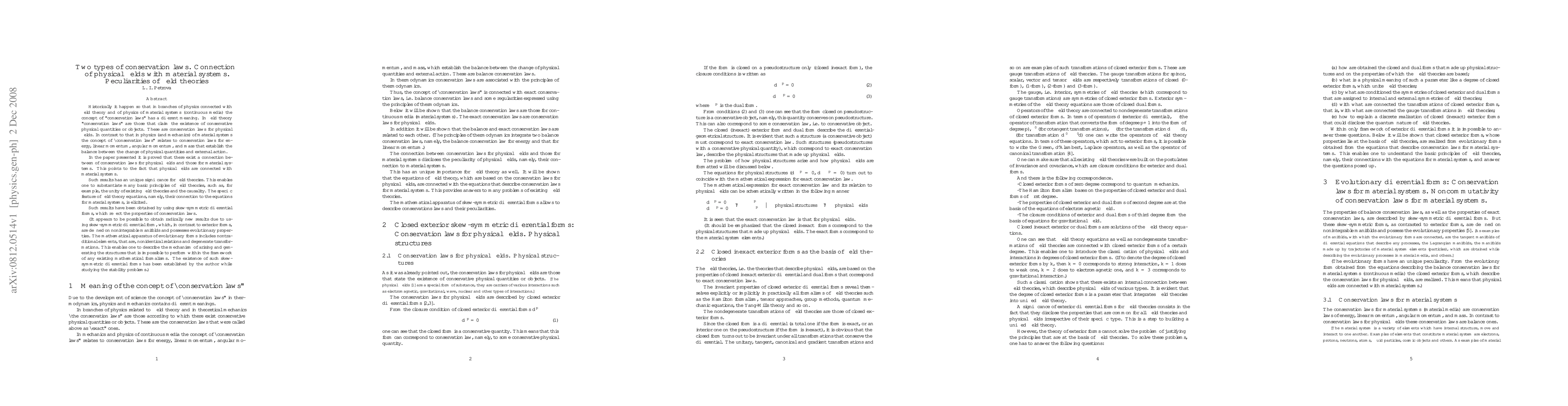 This paper explores the distinction between conservation laws in field theory and material systems, proving a connection between them, which underscores the link between physical fields and material systems, thereby supporting fundamental principles of field theories like unity and causality. The findings utilize skew-symmetric differential forms to elucidate these connections.