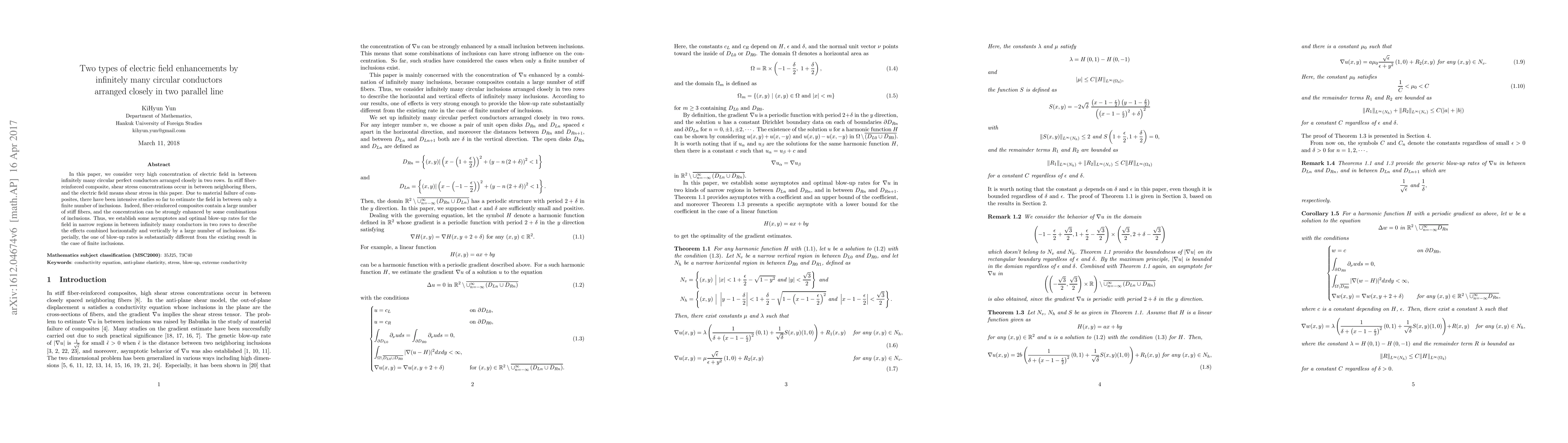 This paper investigates electric field enhancements between infinitely many closely arranged circular conductors in two parallel lines, analogous to shear stress concentrations in fiber-reinforced composites. It establishes asymptotes and optimal blow-up rates for the field, revealing a significantly different enhancement rate compared to finite inclusion scenarios.