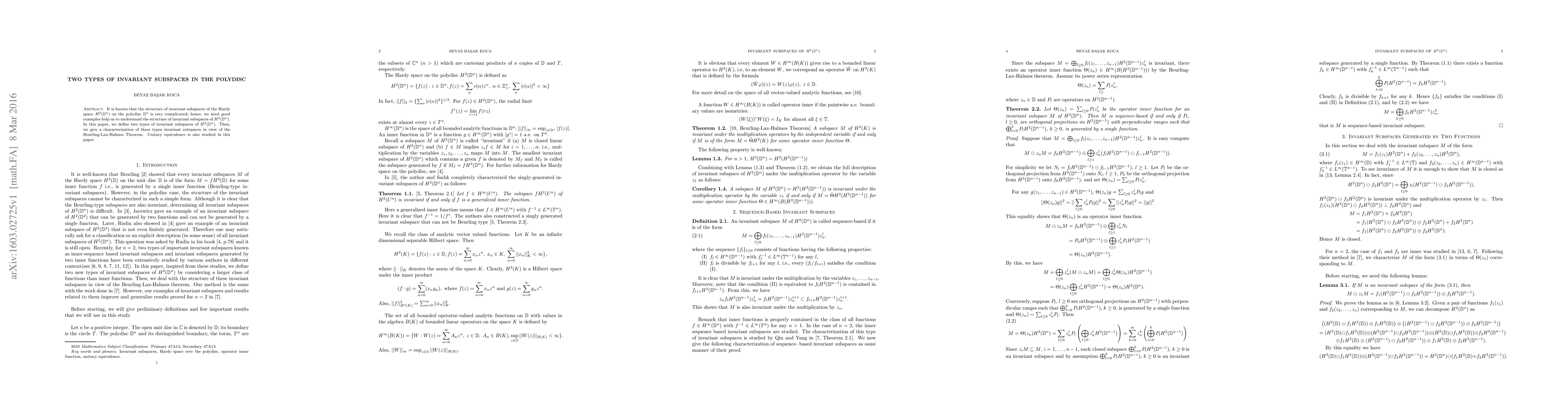 This paper defines and characterizes two types of invariant subspaces in the Hardy space $H^2(\mathbb D^n)$ on the polydisc $\mathbb{D}^n$, providing insight into their structure through the Beurling-Lax-Halmos Theorem and examining unitary equivalence between them.
