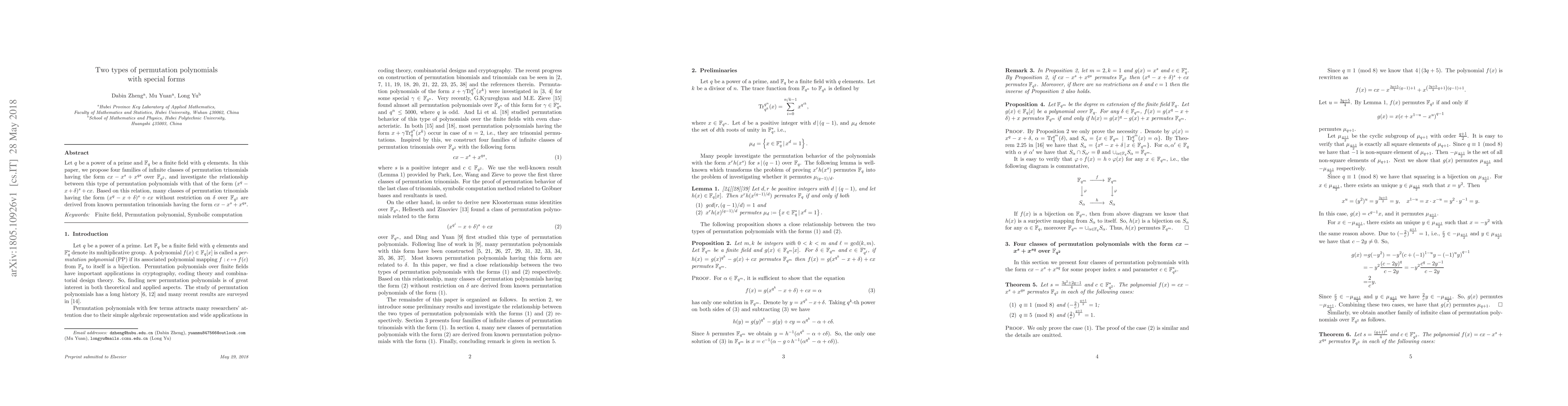 This paper presents four infinite classes of permutation trinomials of the form cx-x^s + x^{qs} over F_{q^2}, analyzing their relationship with trinomials of the form (x^q-x+delta)^s+cx. It derives numerous classes of the latter form without restrictions on u03b4 from known trinomials of the former form, contributing to the understanding of permutation polynomials over finite fields.
