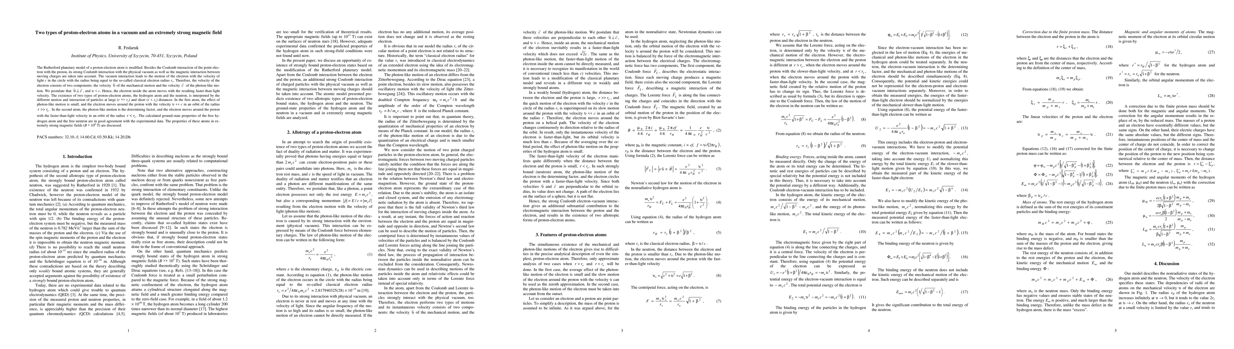 The Rutherford planetary model of a proton-electron atom is modified. Besides the Coulomb interaction of the point electron with the proton, its strong Coulomb interaction with the physical vacuum as well as the magnetic interaction between moving charges are taken into account. The vacuum interaction leads to the motion of the electron with the velocity of light \textit{c} in the circle with the radius being equal to the so-called classical electron radius $r_e$. Therefore, the velocity of the electron consists of two components: the velocity $\vec{\upsilon}$ of the mechanical motion and the velocity $\vec{c}$ of the photon-like motion. We postulate that $\vec{\upsilon}\bot \vec{c}$, and $\upsilon < c $. Hence, the electron inside the atom moves with the resulting faster-than-light velocity. The existence of two types of proton-electron atoms, the hydrogen atom and the neutron, is interpreted by the different motion and interaction of particles at large ($ r >> r_e $) and short ($ r < r_e $) distances. In the first atom, the effect of photon-like motion is small, and the electron moves around the proton with the velocity $\upsilon << c$ in an orbit of the radius $ r>>r_{e}$. In the second atom, the photon-like motion is the determining factor, and the electron moves around the proton with the faster-than-light velocity in an orbit of the radius $r < r_{e}$. The calculated ground-state properties of the free hydrogen atom and the free neutron are in good agreement with the experimental data. The properties of these atoms in extremely strong magnetic fields ($B >> 10^8 T$) that are typical for neutron stars are discussed.