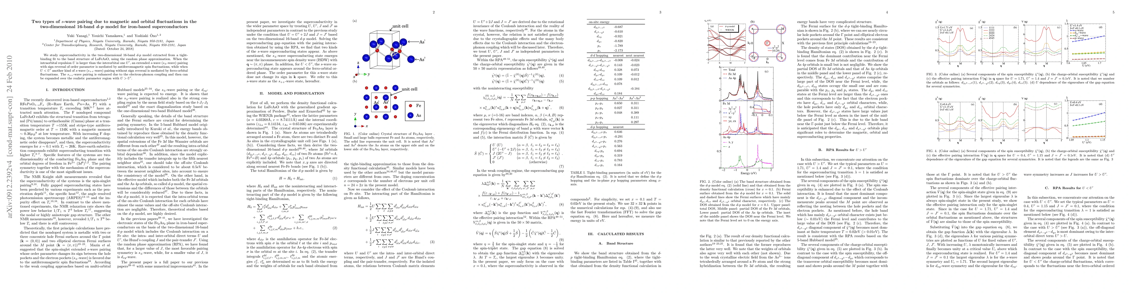 This paper investigates superconductivity in a two-dimensional 16-band d-p model for iron-based superconductors, revealing two types of s-wave pairing: s+--wave mediated by antiferromagnetic spin fluctuations when intraorbital repulsion is greater than interorbital repulsion, and s++-wave mediated by ferro-orbital fluctuations when the interorbital repulsion is larger.