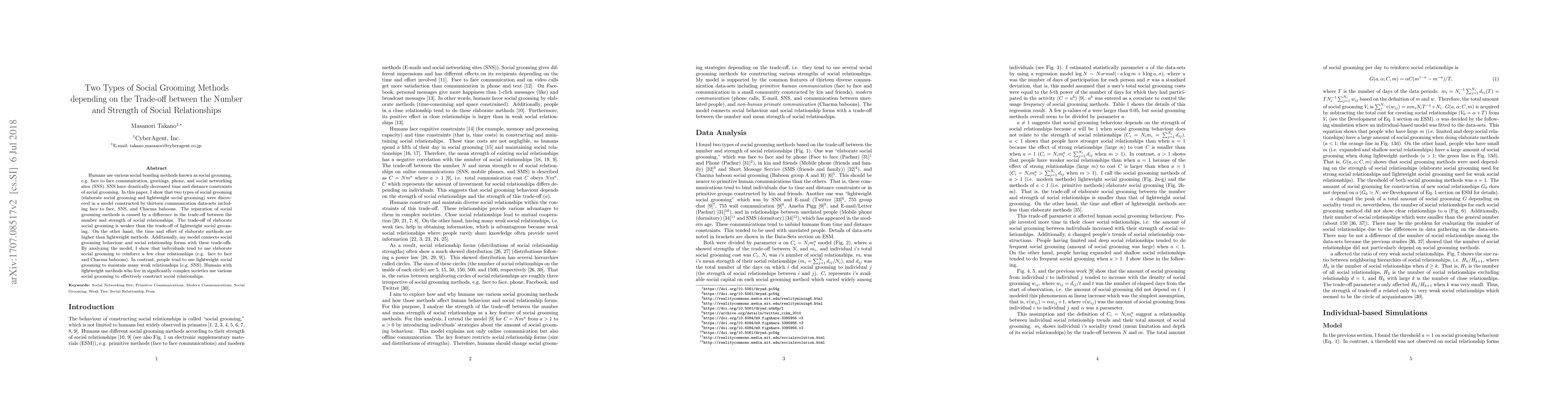 Humans use various social bonding methods known as social grooming, e.g. face to face communication, greetings, phone, and social networking sites (SNS). SNS have drastically decreased time and distance constraints of social grooming. In this paper, I show that two types of social grooming (elaborate social grooming and lightweight social grooming) were discovered in a model constructed by thirteen communication data-sets including face to face, SNS, and Chacma baboons. The separation of social grooming methods is caused by a difference in the trade-off between the number and strength of social relationships. The trade-off of elaborate social grooming is weaker than the trade-off of lightweight social grooming. On the other hand, the time and effort of elaborate methods are higher than lightweight methods. Additionally, my model connects social grooming behaviour and social relationship forms with these trade-offs. By analyzing the model, I show that individuals tend to use elaborate social grooming to reinforce a few close relationships (e.g. face to face and Chacma baboons). In contrast, people tend to use lightweight social grooming to maintain many weak relationships (e.g. SNS). Humans with lightweight methods who live in significantly complex societies use various social grooming to effectively construct social relationships.