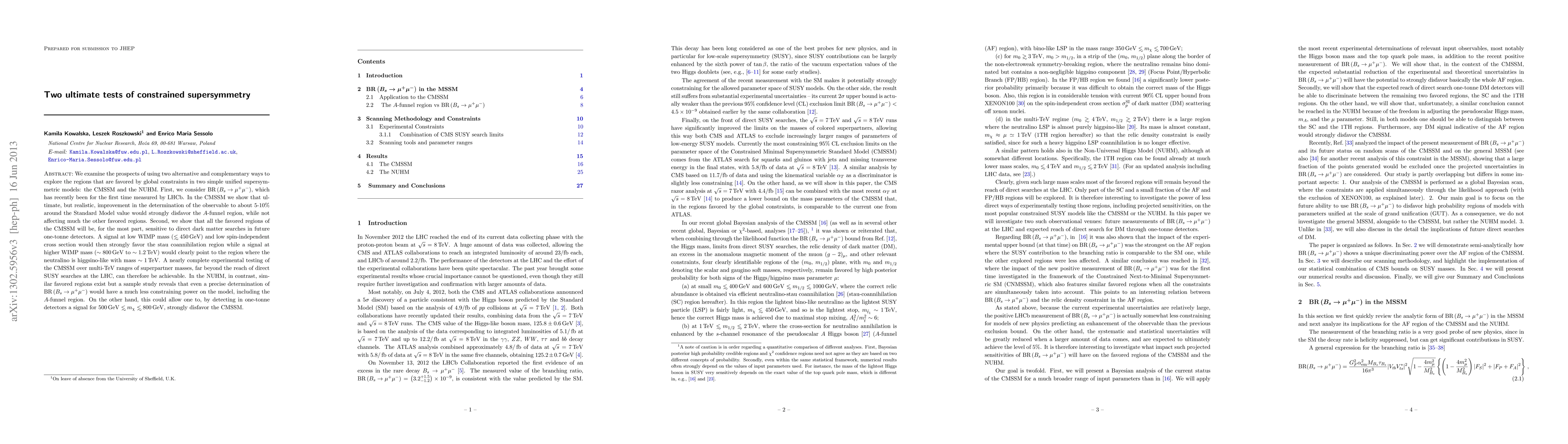 Researchers explore two ways to test constrained supersymmetry models using LHCb data on Bs->πλ decay and one-tonne detectors for dark matter searches, finding that precise measurements could strongly favor specific regions of the models.