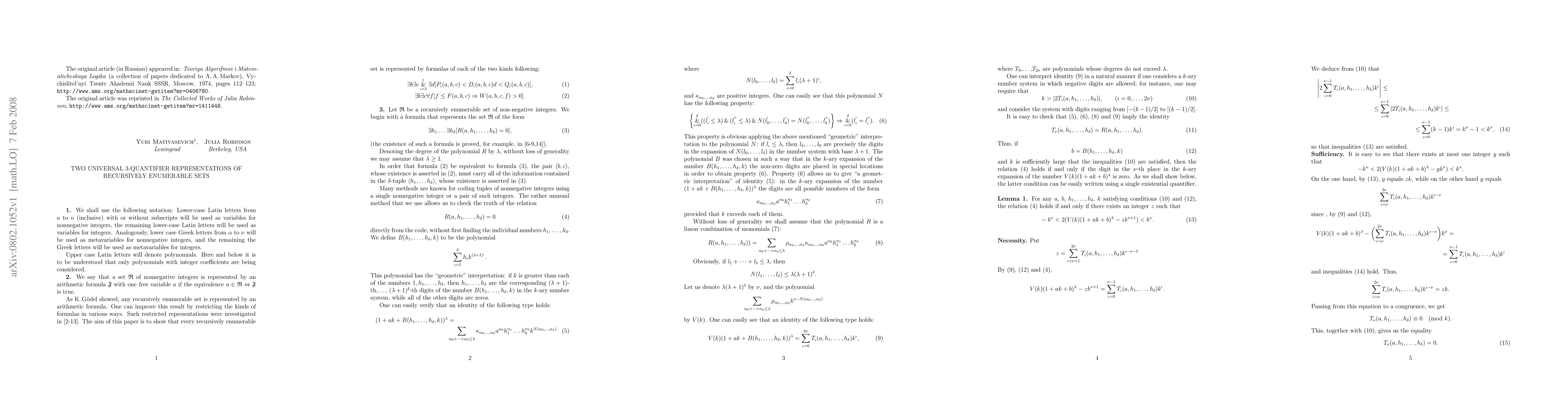 Summary: This paper demonstrates that any recursively enumerable set of natural numbers can be represented using two distinct types of arithmetic formulas, each containing exactly three quantifiers. This establishes a universal 3-quantifier representation for such sets.