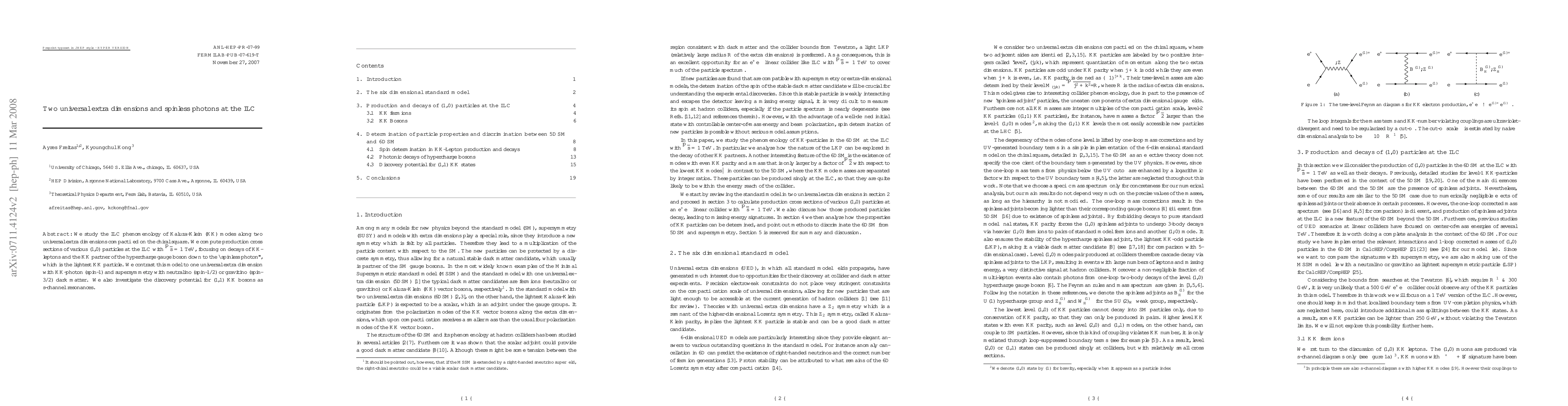We study the ILC phenomenology of (1,0) Kaluza-Klein (KK) modes along two universal extra dimensions compactified on the chiral square. We compute production cross sections of various (1,0) particles at the ILC with sqrt(s)=1 TeV, focusing on decays of KK-leptons and the KK partner of hypercharge gauge boson down to the "spinless photon", which is the lightest KK particle. We contrast this model to one universal extra dimension with KK-photon (spin-1) and supersymmetry with neutralino (spin-1/2) or gravitino (spin-3/2) dark matter. We also investigate the discovery potential for (1,1) KK bosons as s-channel resonances.