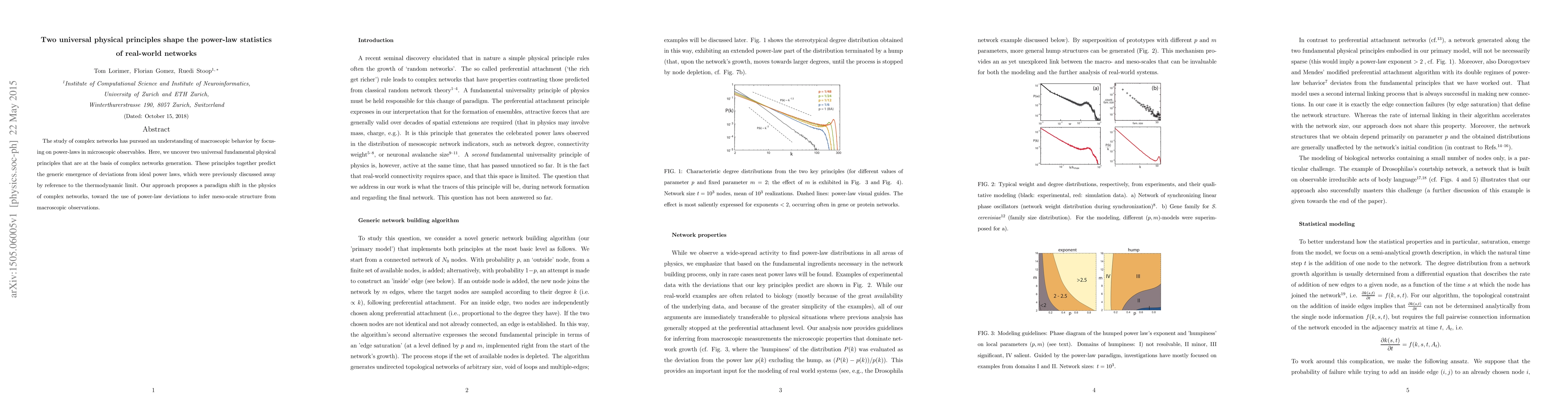 The study of complex networks has pursued an understanding of macroscopic behavior by focusing on power-laws in microscopic observables. Here, we uncover two universal fundamental physical principles that are at the basis of complex networks generation. These principles together predict the generic emergence of deviations from ideal power laws, which were previously discussed away by reference to the thermodynamic limit. Our approach proposes a paradigm shift in the physics of complex networks, toward the use of power-law deviations to infer meso-scale structure from macroscopic observations.