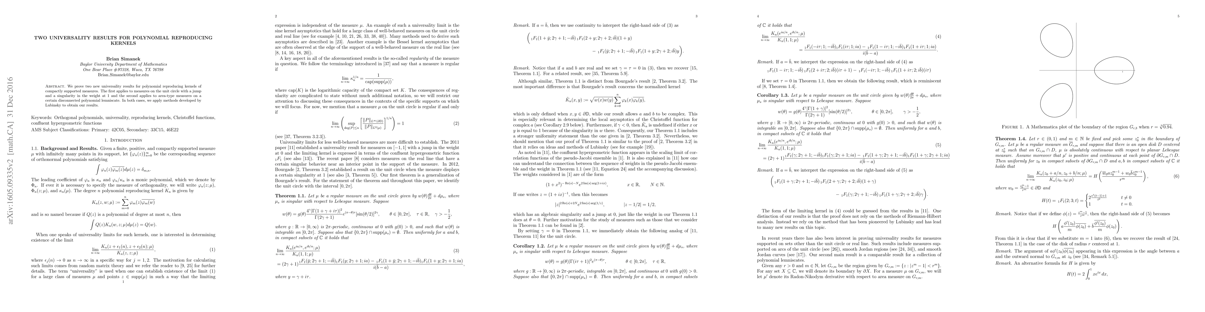 This paper establishes two universality results for polynomial reproducing kernels associated with compactly supported measures. The first result pertains to measures on the unit circle with specific weight singularities, while the second applies to area-type measures on a disconnected polynomial lemniscate, utilizing methods developed by Lubinsky.