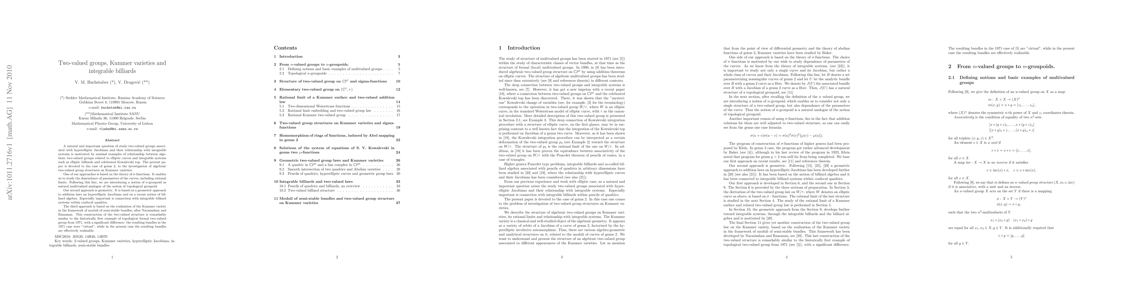 A natural and important question of study two-valued groups associated with hyperelliptic Jacobians and their relationship with integrable systems is motivated by seminal examples of relationship between algebraic two-valued groups related to elliptic curves and integrable systems such as elliptic billiards and celebrated Kowalevski top. The present paper is devoted to the case of genus 2, to the investigation of algebraic two-valued group structures on Kummer varieties. One of our approaches is based on the theory of $\sigma$-functions. It enables us to study the dependence of parameters of the curves, including rational limits. Following this line, we are introducing a notion of $n$-groupoid as natural multivalued analogue of the notion of topological groupoid. Our second approach is geometric. It is based on a geometric approach to addition laws on hyperelliptic Jacobians and on a recent notion of billiard algebra. Especially important is connection with integrable billiard systems within confocal quadrics. The third approach is based on the realization of the Kummer variety in the framework of moduli of semi-stable bundles, after Narasimhan and Ramanan. This construction of the two-valued structure is remarkably similar to the historically first example of topological formal two-valued group from 1971, with a significant difference: the resulting bundles in the 1971 case were "virtual", while in the present case the resulting bundles are effectively realizable.