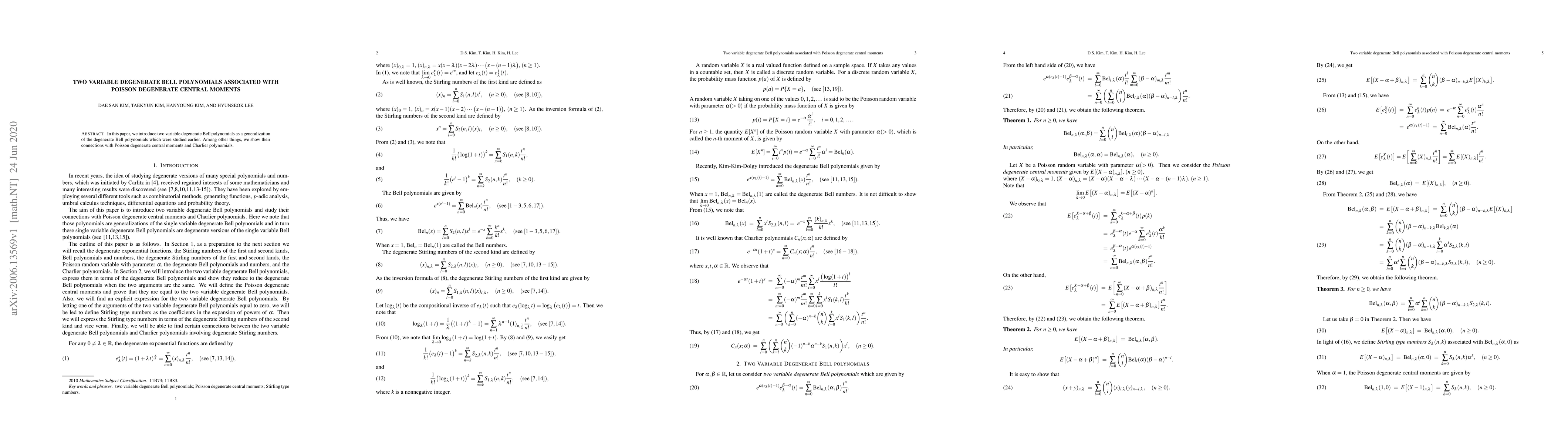 Summary: This research introduces two-variable degenerate Bell polynomials, generalizing earlier versions, and demonstrates their link to Poisson degenerate central moments and Charlier polynomials.