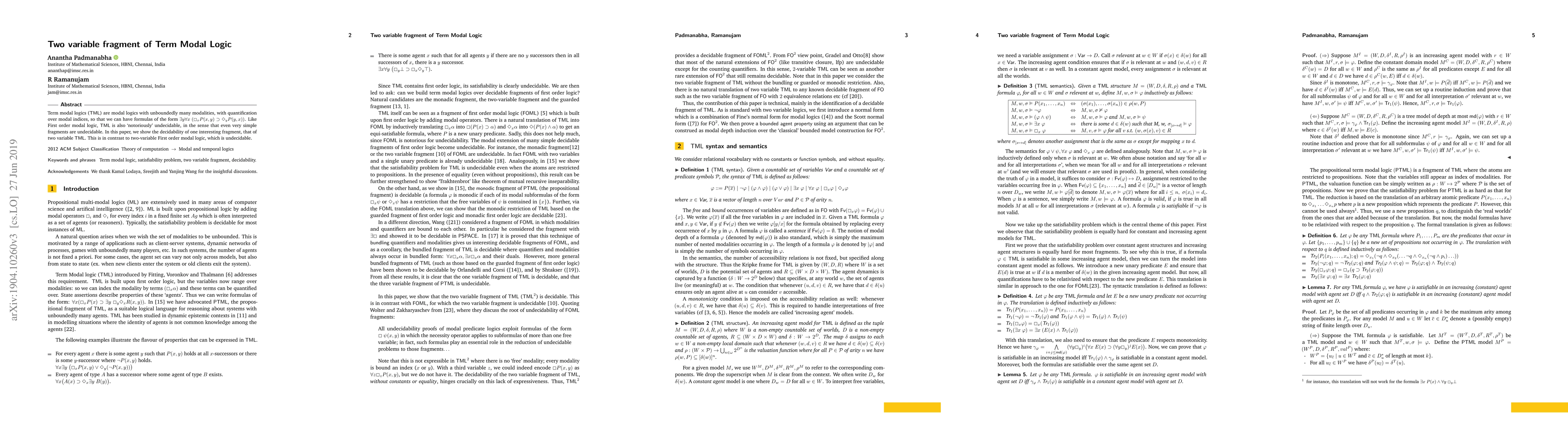 This paper demonstrates the decidability of the two-variable fragment of Term Modal Logic (TML), contrasting it with the undecidability of the two-variable fragment in First Order Modal Logic. This finding highlights a notable difference in complexity between TML and its first-order counterpart.