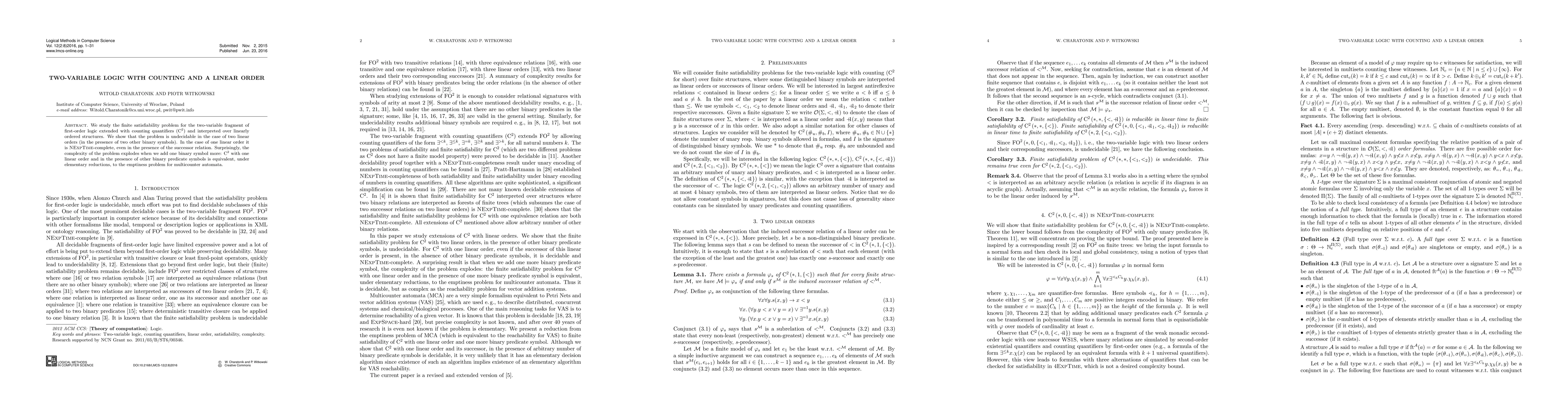 The research investigates the finite satisfiability problem for two-variable logic with counting and a linear order, revealing it is undecidable with two linear orders and NEXPTIME-complete with one. Adding an additional binary symbol elevates complexity to equivalence with multicounter automata's emptiness problem.