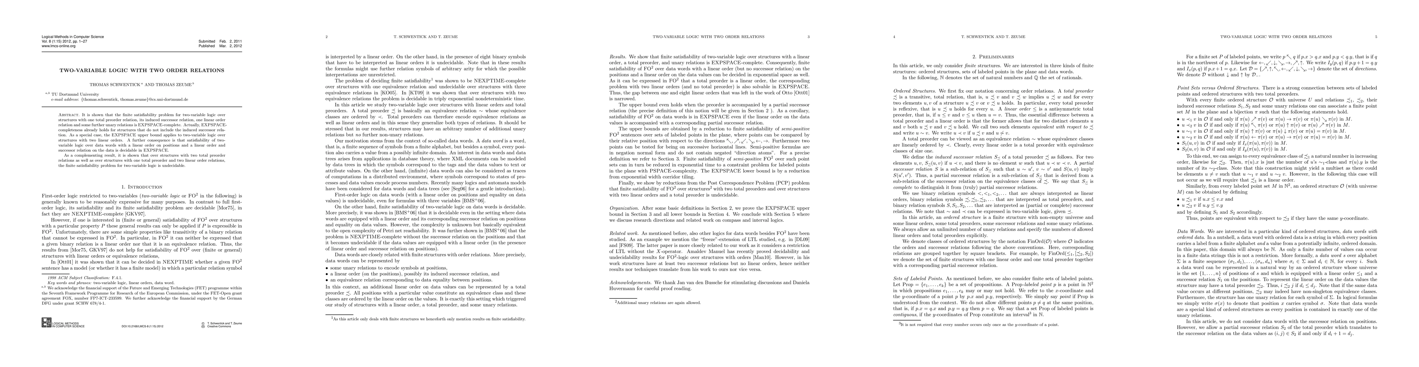The paper demonstrates that the finite satisfiability problem for two-variable logic with one total preorder and one linear order is EXPSPACE-complete. It also shows that the problem is undecidable for structures with two total preorder relations or one total preorder and two linear orders.