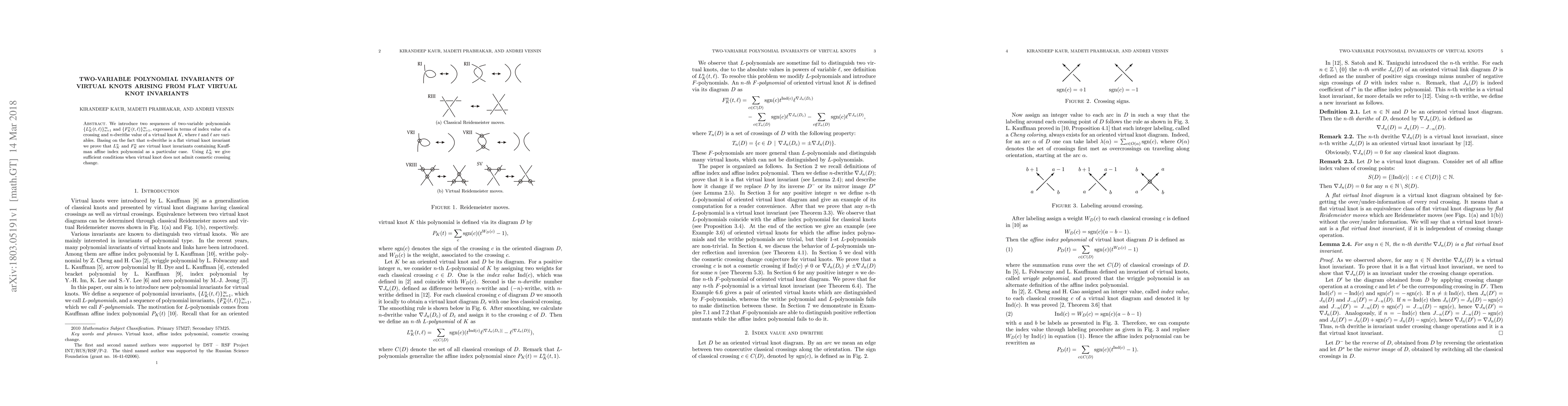 We introduce two sequences of two-variable polynomials $\{ L^n_K (t, \ell)\}_{n=1}^{\infty}$ and $\{ F^n_K (t, \ell)\}_{n=1}^{\infty}$, expressed in terms of index value of a crossing and $n$-dwrithe value of a virtual knot $K$, where $t$ and $\ell$ are variables. Basing on the fact that $n$-dwrithe is a flat virtual knot invariant we prove that $L^n_K$ and $F^n_K$ are virtual knot invariants containing Kauffman affine index polynomial as a particular case. Using $L^n_K$ we give sufficient conditions when virtual knot does not admit cosmetic crossing change.