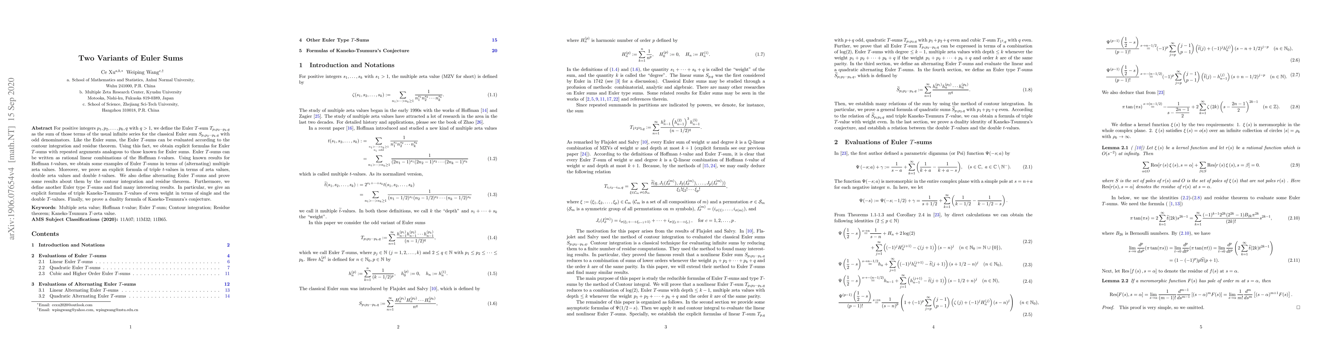 This research paper explores two variants of Euler sums, termed Euler $T$-sums and alternating Euler $T$-sums, alongside their properties and evaluations. It provides explicit formulas for these sums using the Contour integral and residue theorem, expressing them in terms of Hoffman $t$-values, multiple zeta values, and triple $t$-values, ultimately proving a duality formula related to Kaneko-Tsumura's conjecture.