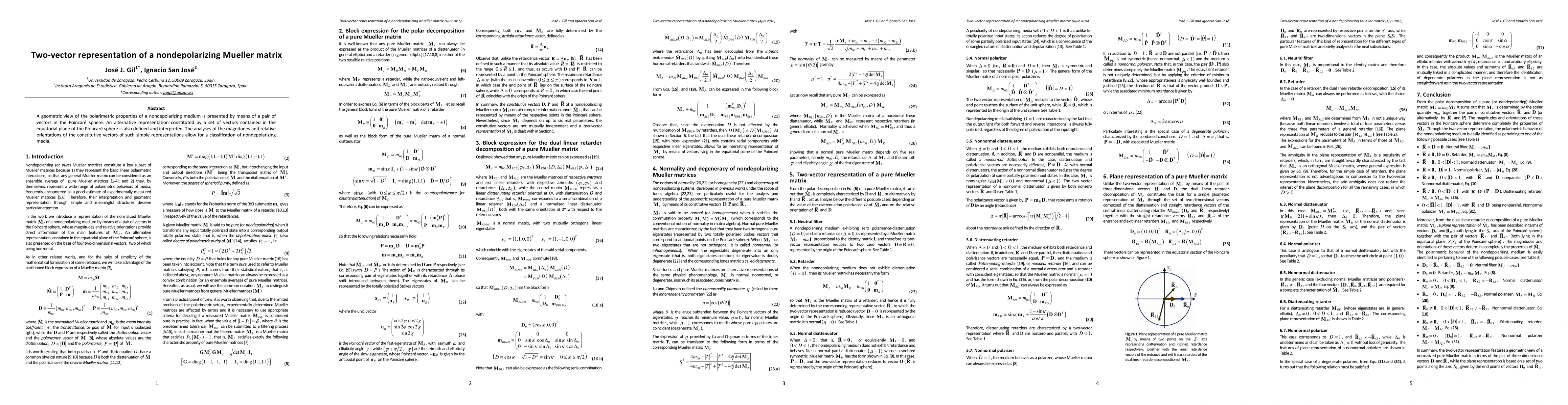 This paper introduces a two-vector representation of a nondepolarizing Mueller matrix using Poincaré sphere vectors, offering a geometric interpretation of polarimetric properties. It also defines an alternative equatorial plane vector set for classification of nondepolarizing media based on vector magnitudes and orientations.