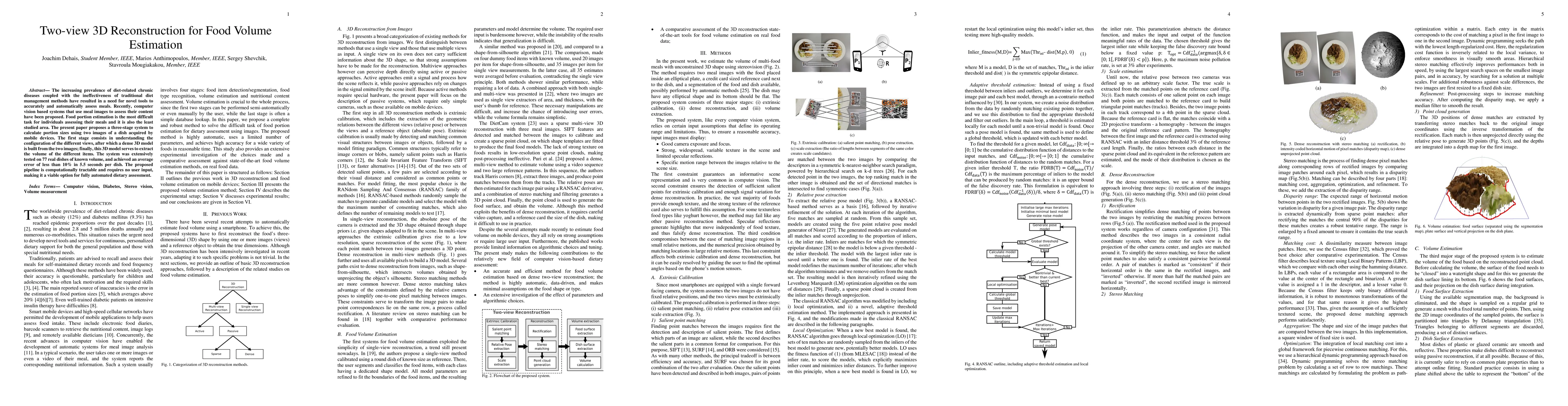 The paper presents a system using two images to estimate food volume, achieving an average error of less than 10% in 5.5 seconds per dish. This automated method, requiring no user input, could revolutionize dietary assessment.